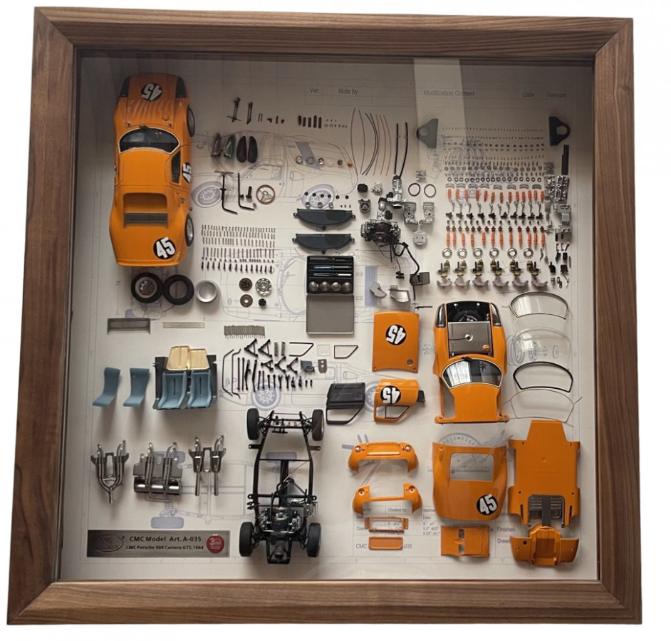 Popis modelu: Rám s rozloženým modelem Porsche Carrera GTS 904. Účelem je kromě dekorace ukázat, z kolika dílů je model sestaven a co vše je ve skutečnosti skryto pro běžné pozorování. Sestava by měla být namontována na koženou desku s hliníkovým rámem, vše by mělo být zakryto akrylátovým krytem, jako ochranou proti prachu.