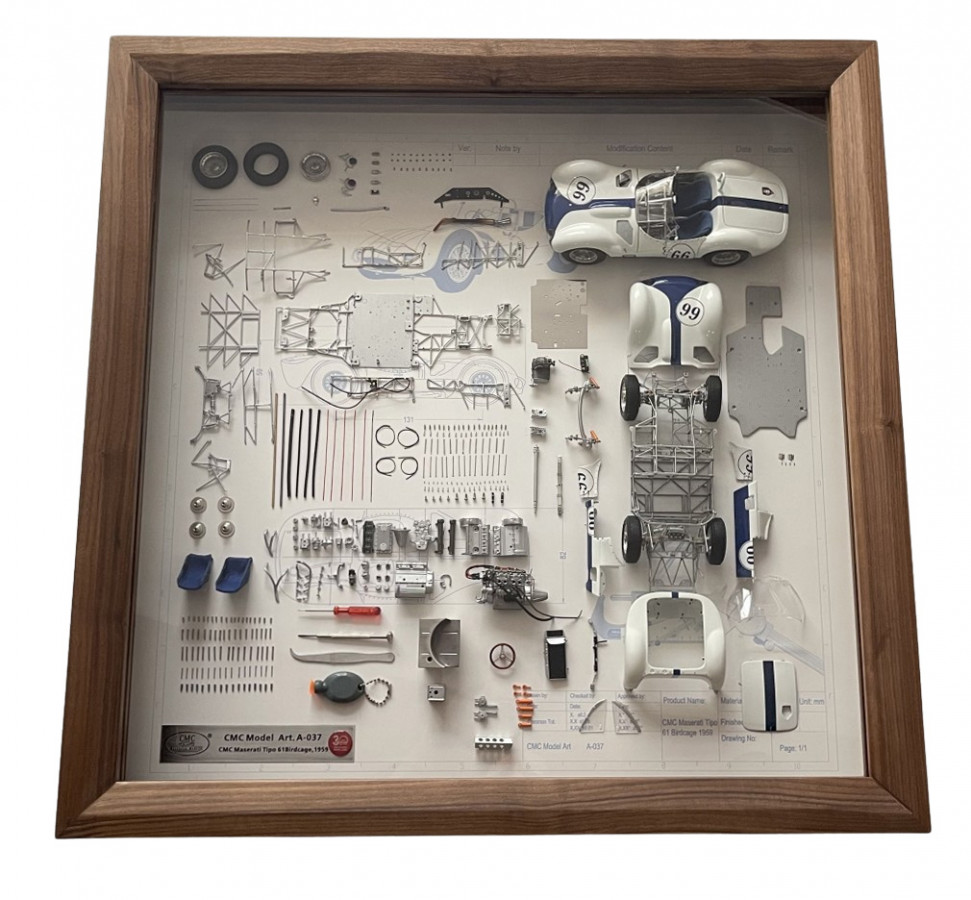 Popis modelu: Rám s rozloženým modelem Maserati Tipo 61 “Birdcage”. Účelem je kromě dekorace ukázat, z kolika dílů je model sestaven a co vše je ve skutečnosti skryto pro běžné pozorování. Sestava by měla být namontována na koženou desku s hliníkovým rámem, vše by mělo být zakryto akrylátovým krytem, jako ochranou proti prachu.