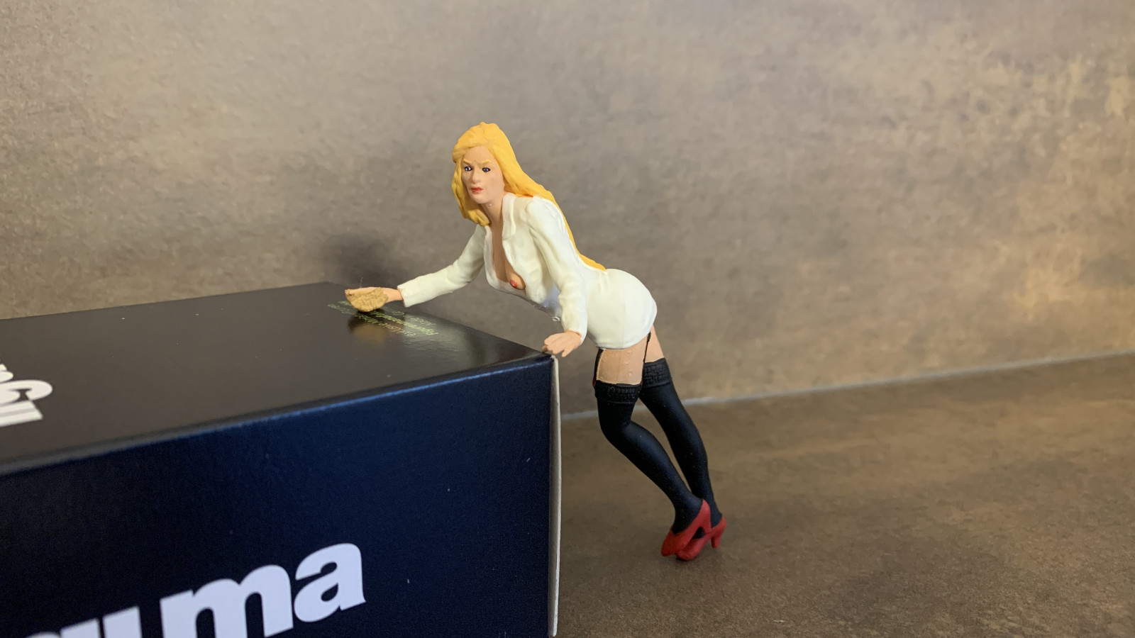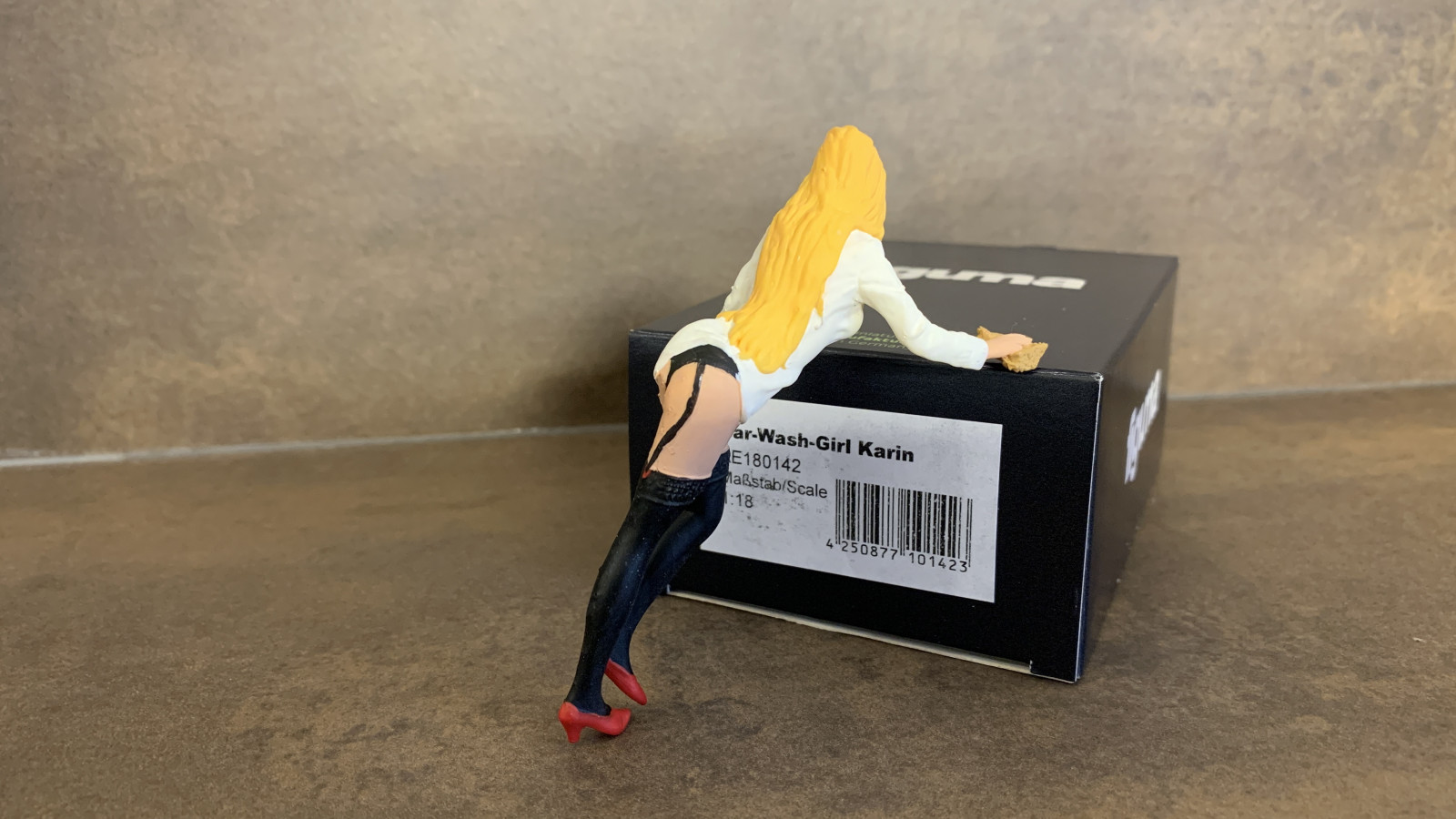 Postava opírající se dívky, jak její volně přeložený název vybízí, jaky kdyby vypadla z scény či situace v myčce na srazu upravených vozů.