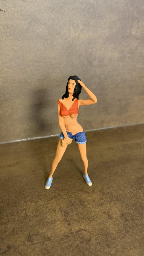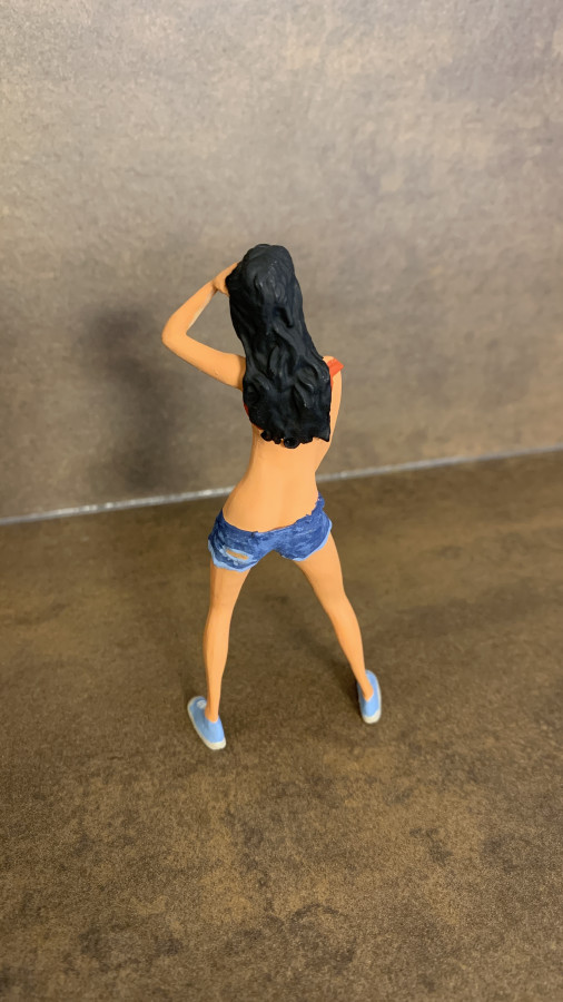 Postava volně stojící dívky, jak její volně přeložený název vybízí, jaky kdyby vypadla z scény či situace v myčce na srazu upravených vozů.