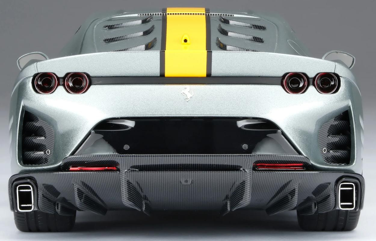 S odkazem na ikonické Ferrari 330 P4 byl impozantní zadní spoiler vozu zvednut výše a tento design na míru také rozšiřuje záď, čímž dodává zádi výraznější vzhled. Konce tohoto aerodynamického přívěsku se protínají s linií zadních křídel, čímž zdůrazňují jejich svalnatý vzhled a odkazují na ikonické vozy 330 P3/P4. Zadní část karoserie s erby je nyní vroubkovaná, což zdůrazňuje trojrozměrnost a osobitost boků vozu. Zadní světelné bloky dodávají vozu agresivnější a evokující vzhled.