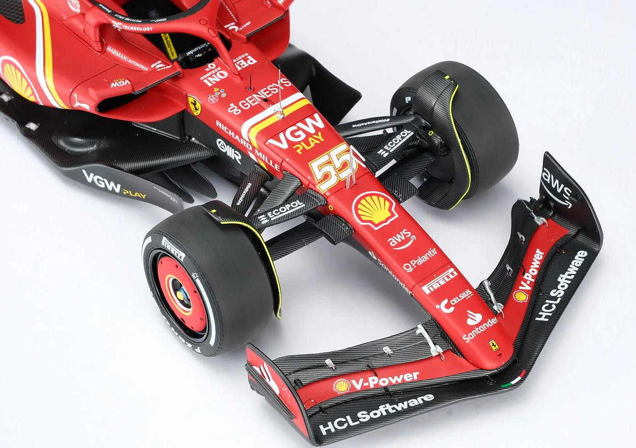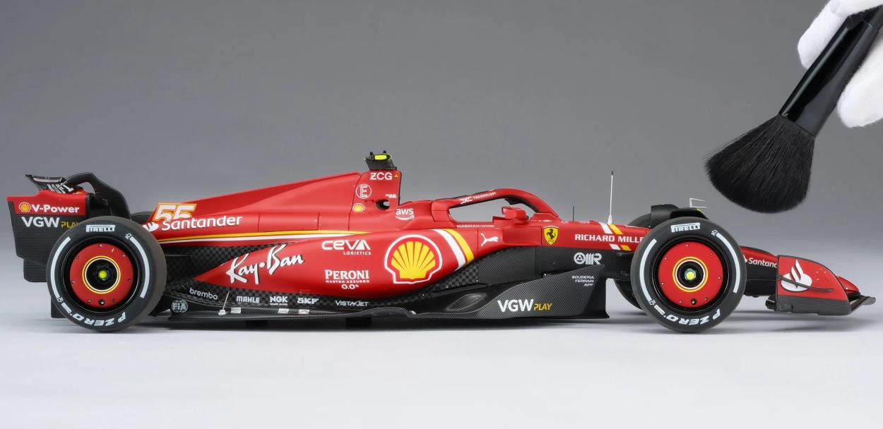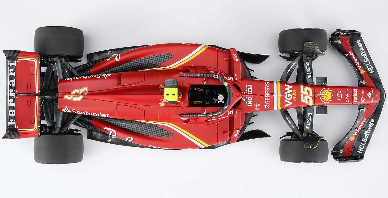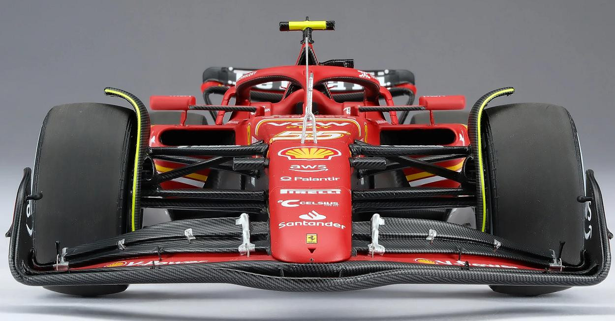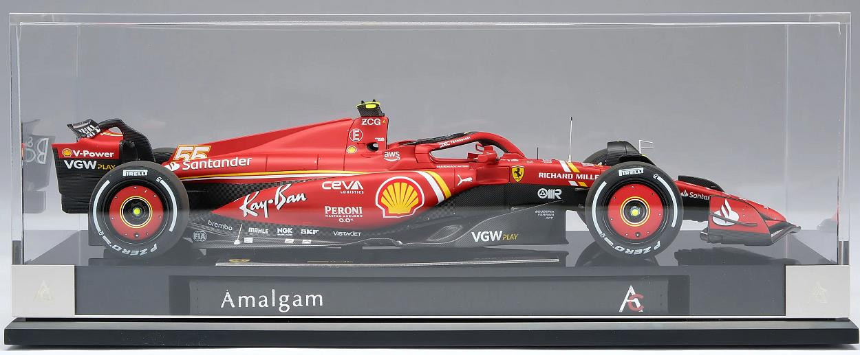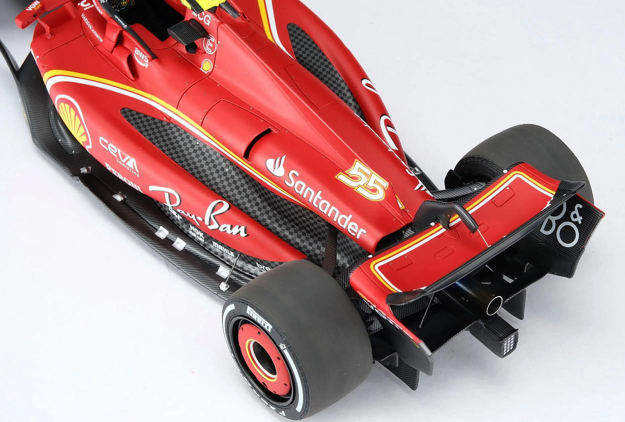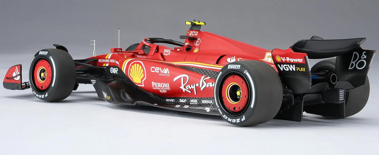 Tento skvělý model v měřítku 1:18 představuje vůz Ferrari SF-24, který Carlos Sainz dovedl k vítězství ve Velké ceně Austrálie Formule 1 na okruhu Albert Park 24. března 2024. Přestože Sainz podstoupil operaci zánětu slepého střeva a jen dva týdny předtím vynechal závod v Saúdské Arábii, vrátil se ke svému vozu SF-24 a okamžitě vyzval vedoucího šampionátu Verstappena o pole position, na kterého těsně ztratil pouhých 0,27 sekundy. Leclerc by se kvalifikoval na pátém místě, s další ztrátou 0,25 sekundy za druhým McLarenem Sergia Péreze a Landa Norrise v Red Bullu. Verstappen udržel vedení před Sainzem z cílové čáry, zatímco Norris a Leclerc Péreze předjeli do první zatáčky. Po pouhém jednom celém kole Sainz efektivně využil svého DRS k dojetí na Verstappena a mezi zatáčkami 9 a 10 se projel, čehož využil, když Nizozemec hlásil problémy s brzděním. Red Bull brzy odstoupil kvůli selhání brzd, což dalo Sainzovi skvělou příležitost proměnit svůj náskok ve vítězství. V desátém kole zvýšil náskok na tři sekundy, zatímco Leclerc zajel do boxů z třetího místa, aby přezul na tvrdé pneumatiky. V 15. kole zajel Norris do boxů z druhého místa, ale poté, co ho během zastávky v boxech předběhl Leclerc a jeho týmový kolega z McLarenu Oscar Piastri, se vrátil do boxů až na páté místo. Sainz zastavil o kolo později a dostal se pouze za Fernanda Alonsa. Vedení se znovu dostal, když Alonso krátce poté zajel do boxů a těžil z krátkého virtuálního safety caru, který byl spuštěn odcházejícím Mercedesem Lewise Hamiltona. To se brzy vyřešilo a Sainz mohl pokračovat v útoku přes Leclerca, Piastriho, Norrise a Alonsa. Když se závod dostal do poloviny, McLaren si vyměnil vozy, což Norrisovi umožnilo zvýšit tlak na Leclerca, který brzy hlásil, že má problémy s pneumatikami. Monacký jezdec brzy ve 35. kole zajel do boxů, aby si vyměnil tvrdé pneumatiky, a znovu se dostal na čtvrté místo před Pérezem a Alonsem. To vyvolalo vlnu reakcí a jakmile se prodraly poslední zastávky, Sainz si udržel náskok zhruba pěti sekund před Leclercem, Norris o čtyři sekundy zaostával na třetím místě a na Piastriho měl výrazný náskok před ním. Navzdory pozdnímu výjezdu virtuálního safety caru, který byl nasazen po dramatické nehodě Mercedesu George Russella, se Sainz dostal na start s předstihem před Leclercem a zajistil tak Ferrari památný výsledek 1-2, první pro tým od úvodního závodu sezóny 2022. Pro Sainze to bylo jeho třetí vítězství v kariéře a první, když nestartoval z pole position. Prodloužilo to rekord Ferrari jako nejúspěšnějšího týmu v Albert Parku a zpečetilo si tak desáté vítězství na tomto okruhu.