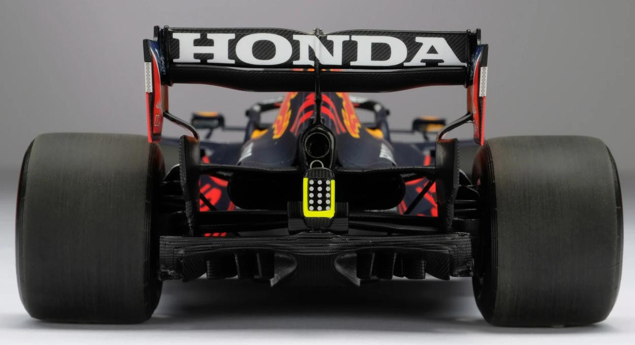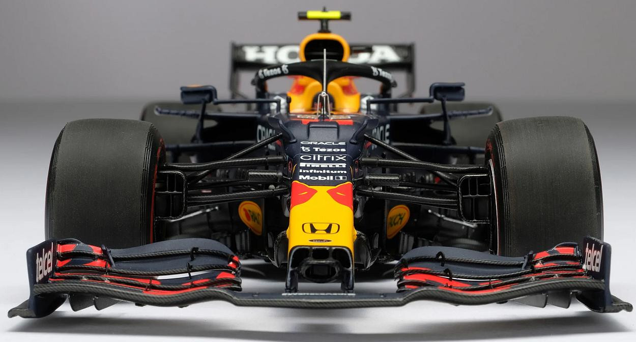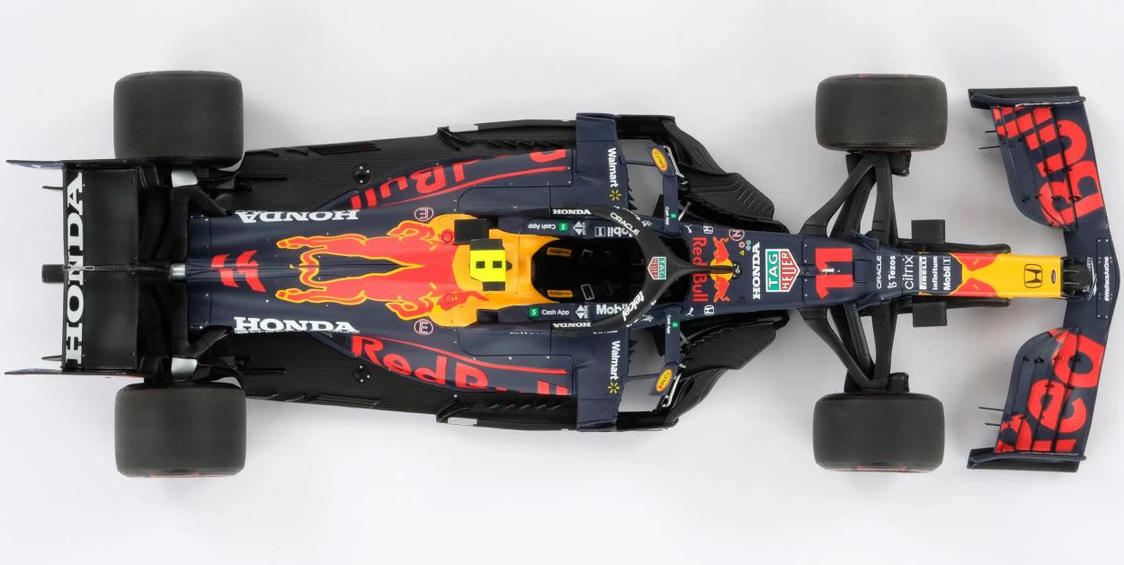 Tento model vozu Red Bull Racing Honda RB16B je modelem vozu, s nímž jezdili Max Verstappen a Sergio Pérez na Velké ceně Formule 1 v Abú Zabí na okruhu Yas Marina 12. prosince 2021. Verstappen si v Yas Marina vybojoval brilantní pole position, ale stejně jako po většinu sezóny se o první řadu dělil s Lewisem Hamiltonem. Důležitý byl závěr závodu, protože po nárazu vozu Williamsu Nicholase Latifiho do zdi byl nutný safety car, což Verstappenovi umožnilo znovu zajet do boxů a v posledním kole sezóny zaútočit na Hamiltona na mnohem čerstvějších pneumatikách. Holanďan ho předjel v páté zatáčce a upevnil si tak vítězství a s ním i titul mistra světa jezdců pro rok 2021.
