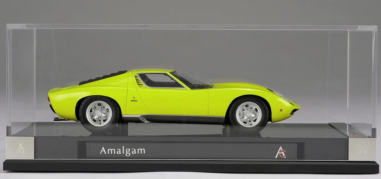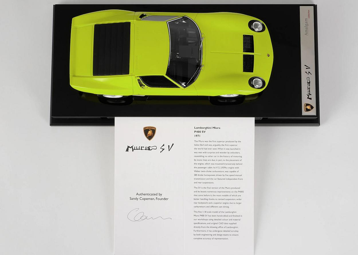 Popis modelu: Model je vyroben z pryskyřičné slitiny RESIN, při této technologii výrobce dosáhl maximální věrnosti modelu ku originálu za cenu nemožnosti cokoli otevřít. Model je dodáván přišroubován na podkladové desce včetně vitríny a bločku vázaného v kůži s informacemi a fotografiemi vozu Lamborghini Miura. Vše je překryto akrylátovým krytem, na rozdíl od jiných výrobců komplet lepeným a s ozdobnými nerezovými kryty dolních rohů. Součástí balení je černá krabice s otevíráním na magnet, uložená v dalším černém papírovém obalu s uchy (tašce). Model je díky změně v přibaleným informacím zařazen do modelové řady Road & Track.