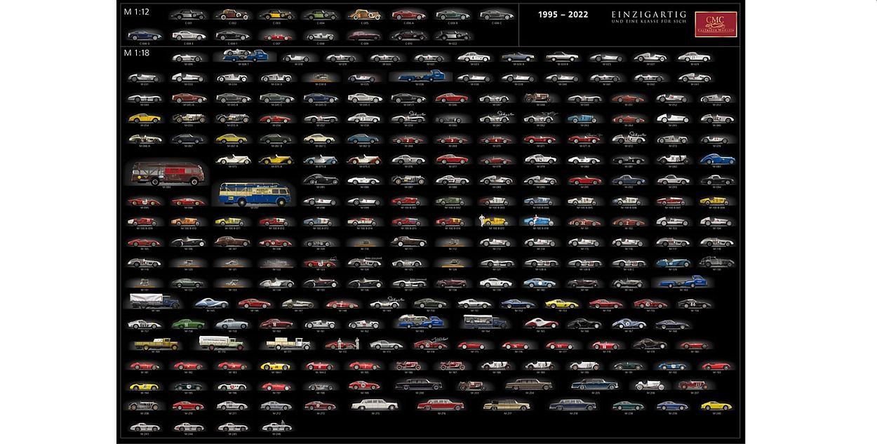 Plakát firmy CMC, jde o updatovanou verzi plakátu k 20. výročí firmy, jsou zde doplněny nové modely včetně verzí Mercedes Pullman, Uhlenhaut Ferrari 275.