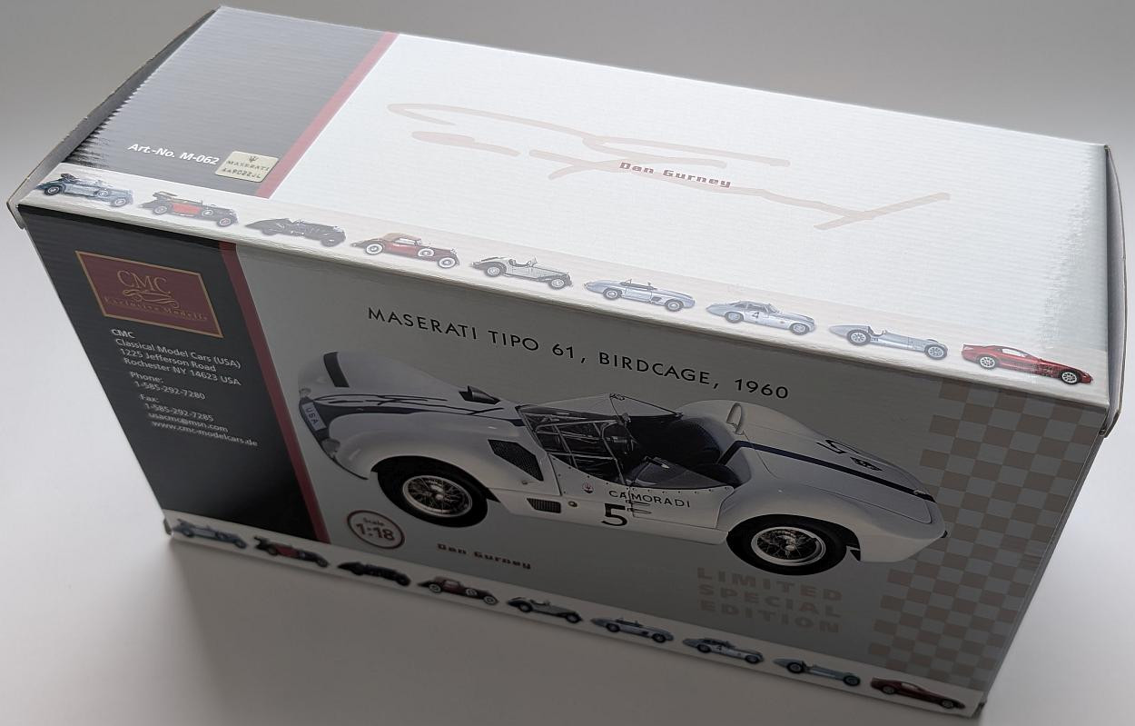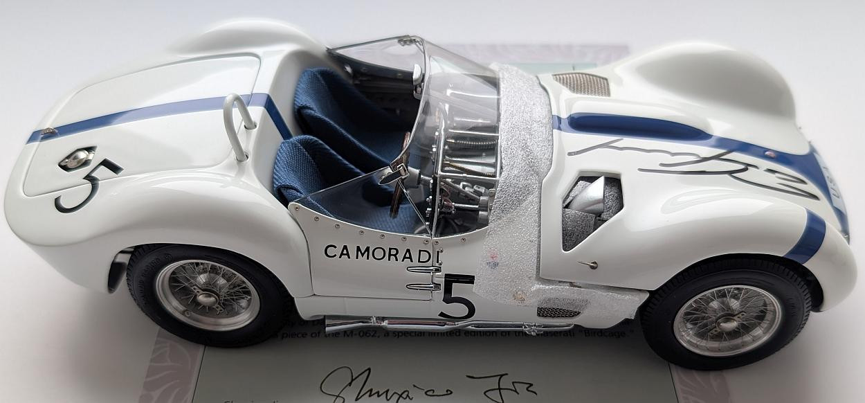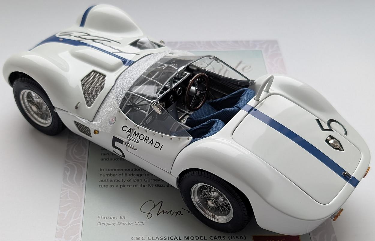 Popis modelu: Model je složen z 1140 jednotlivých dílů, 507 z nich je vyrobeno z nerezové oceli, mědi a mosazi. Tato verze je přesnou replikou vítězného vozu Moss/Gurney. Co je mimořádné na tomto modelu je věrnost karosérie, klecový rám jako by byl pak druhým povrchem. Když sledujete přesné detaily tohoto modelu, cítíte se přeneseni zpět do odvážných zážitků závodů dob dávno minulých. Mimo dopředu odklápěcí přední kapoty, je snímatelný zadní kryt nádrže, kde je skryta i rezerva a otevírací víčko nádrže. Samozřejmostí jsou otevírací dveře, demontovatelná kola, látkou čalouněná sedadla a otevírací víčko olejové nádrže. Pokud Maserati nesbíráte, udělejte výjimku.