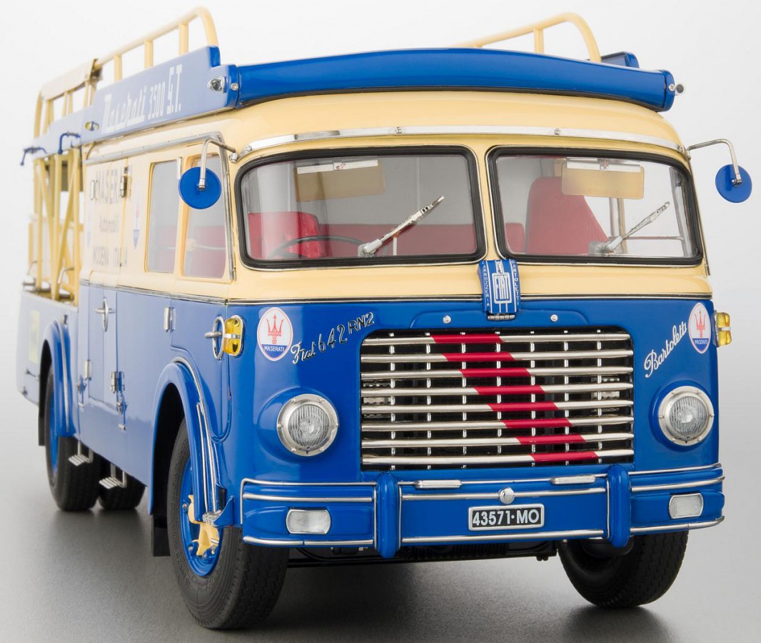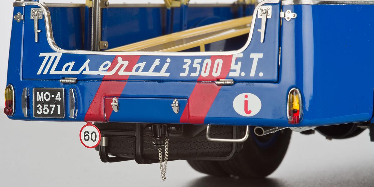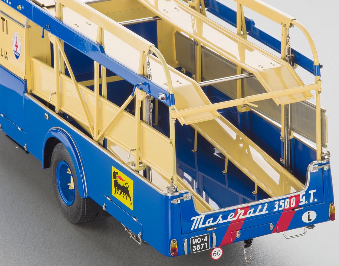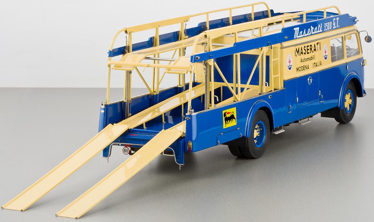 Popis modelu: Tato replika transportéru závodních vozů Maseratii je sestavena z 2640 jednotlivých dílů. Vysoce detailním a funkčním kladkostrojem na vozy může být ručně pohybováno nahoru a dolů. Nájezdy jsou vyrobeny z plechů s autentickou povrchovou úpravou. Zadní víko je opatřeno funkčním trubkovým uzamykacím mechanismem. Rampa je zajištěna pomocí šroubovacích kolíků, vyjmutelné je rezervní kolo, zde je funkční pružinový zámek, za odnímatelným krytem je funkční přírubové tažné zařízení. Vnější zpětná zrcátka jsou nastavitelná, interier je čalouněn kůží. Pod vozem jsou otevírací schránky, včetně zajišťovacích klínů. Víčka hrdla nádrže a stupačky mohou být otevřeny a nebo zavřeny, odklopný je panel Fiat nad přední maskou, pod ním je hrdlo chladiče, jehož víčko může být odšroubováno. Uvnitř kabiny je odklápěcí kryt motoru, funkční stínítka proti slunci. Kromě otevíratelných dveří do kabiny je přístupný i prostor dílny, který je vybaven přihrádkami na náhradní díly. Rozdíl v počtu dílů proti verzi hlavně způsoben jednoduššími nájezdy a lyžinami pro naložené vozy.