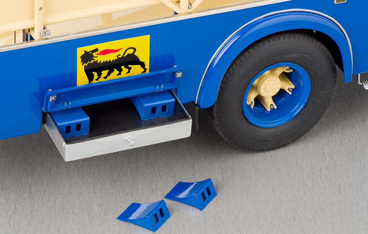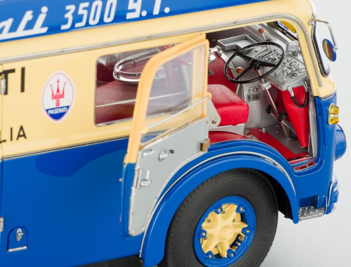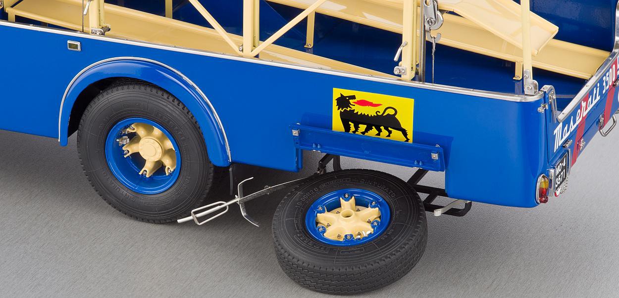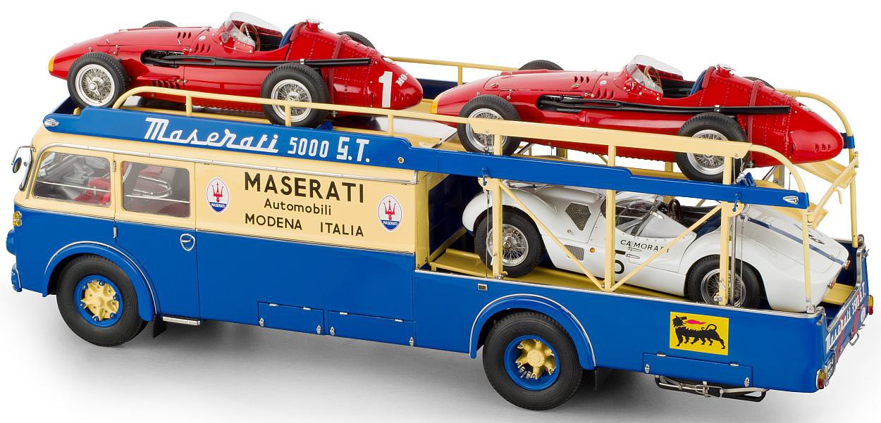 Popis modelu: Tato replika transportéru závodních vozů Maseratii je sestavena z 2640 jednotlivých dílů. Vysoce detailním a funkčním kladkostrojem na vozy může být ručně pohybováno nahoru a dolů. Nájezdy jsou vyrobeny z plechů s autentickou povrchovou úpravou. Zadní víko je opatřeno funkčním trubkovým uzamykacím mechanismem. Rampa je zajištěna pomocí šroubovacích kolíků, vyjmutelné je rezervní kolo, zde je funkční pružinový zámek, za odnímatelným krytem je funkční přírubové tažné zařízení. Vnější zpětná zrcátka jsou nastavitelná, interier je čalouněn kůží. Pod vozem jsou otevírací schránky, včetně zajišťovacích klínů. Víčka hrdla nádrže a stupačky mohou být otevřeny a nebo zavřeny, odklopný je panel Fiat nad přední maskou, pod ním je hrdlo chladiče, jehož víčko může být odšroubováno. Uvnitř kabiny je odklápěcí kryt motoru, funkční stínítka proti slunci. Kromě otevíratelných dveří do kabiny je přístupný i prostor dílny, který je vybaven přihrádkami na náhradní díly. Rozdíl v počtu dílů proti verzi hlavně způsoben jednoduššími nájezdy a lyžinami pro naložené vozy.