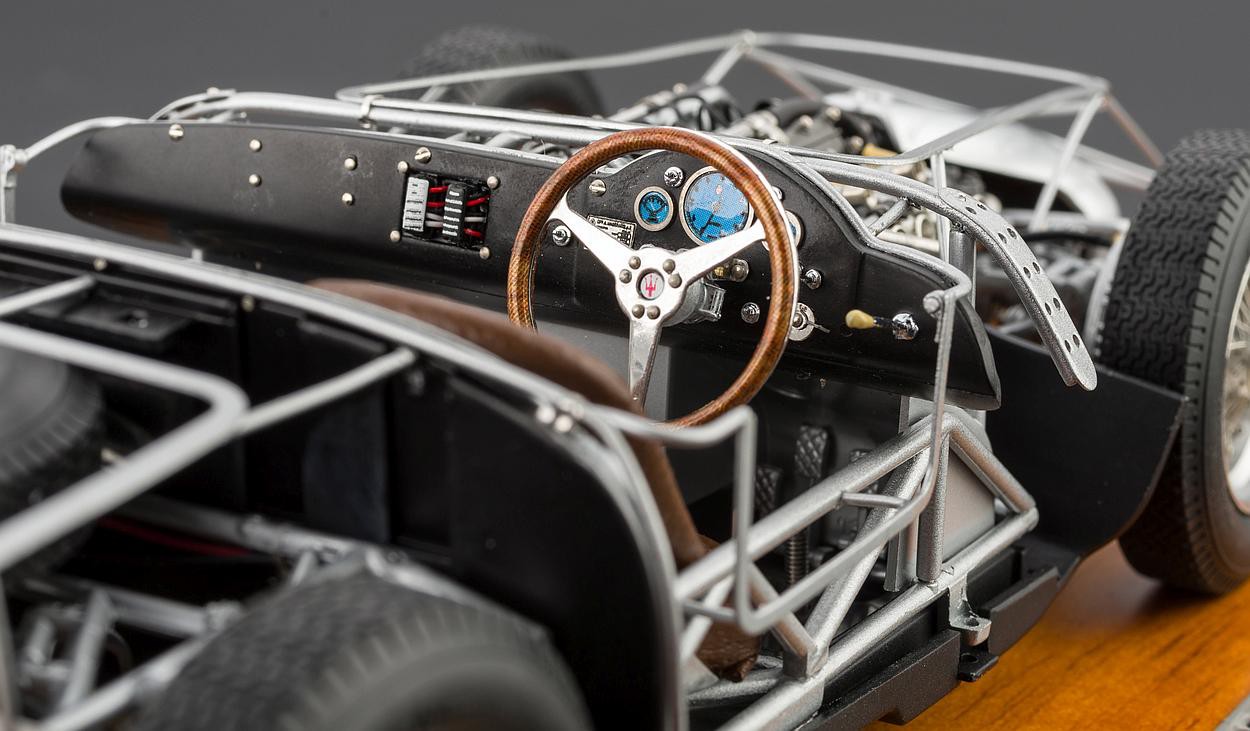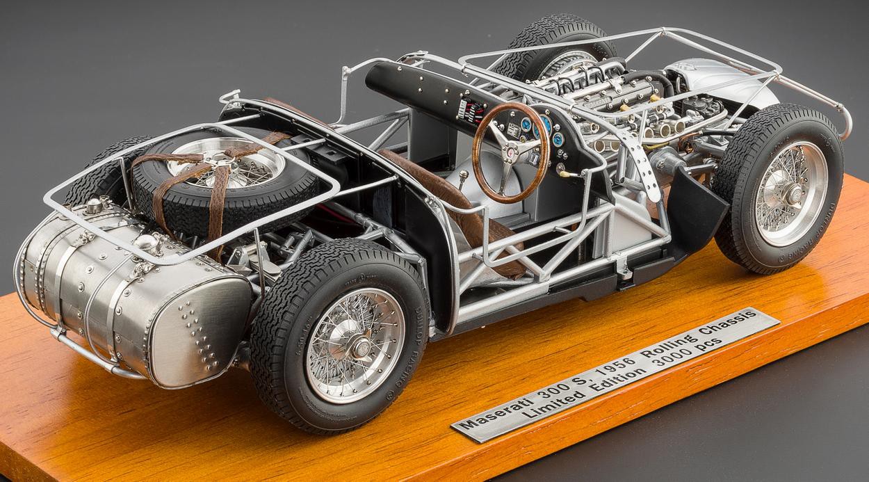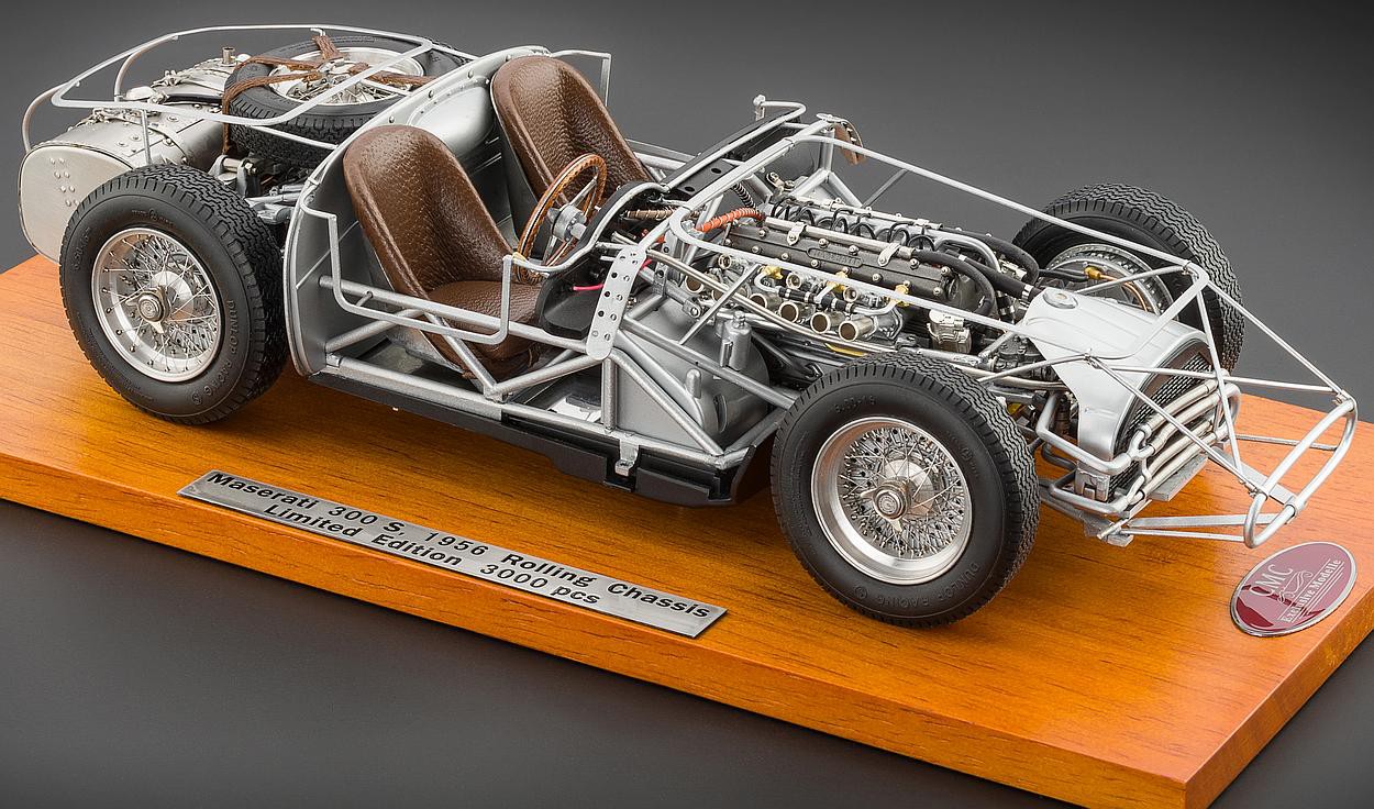 Celosvětově limitovaná edice 3000 kusů Vám představuje chassis a vnitřní uspořádání sportovního a závodního vozu slavného Maserati 300 S. Se sejmutou karoserií máte možnost vidět lehkou konstrukci trubkového rámu a jiných nosných částí, vše lze označit jako království modeláře.