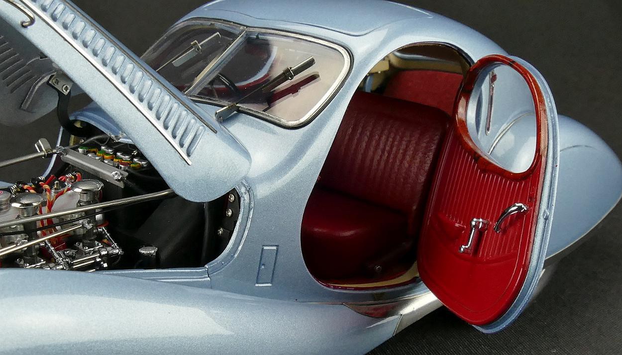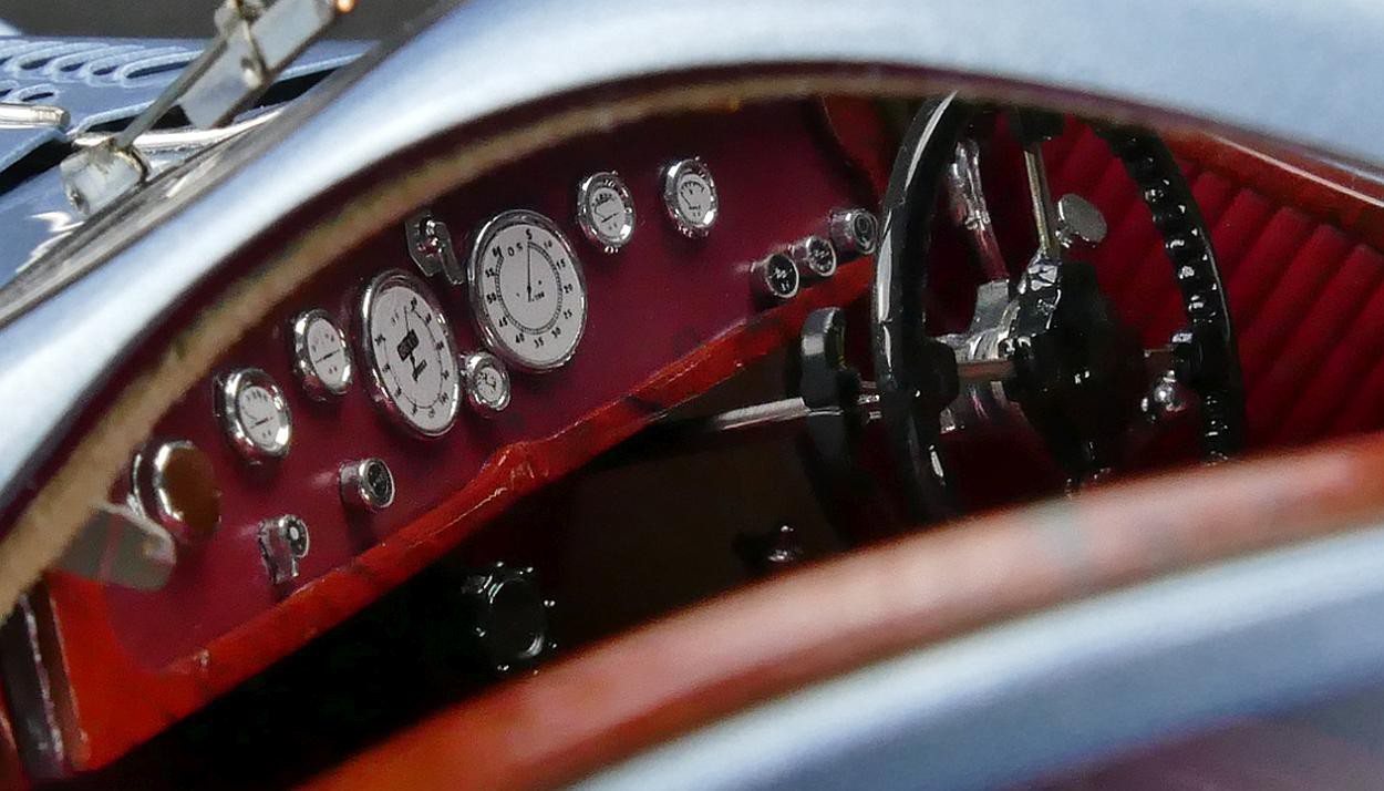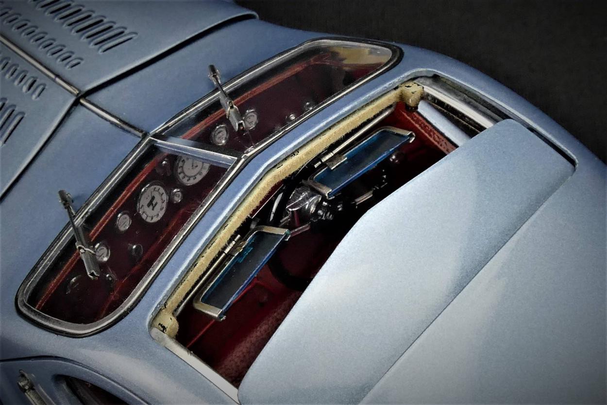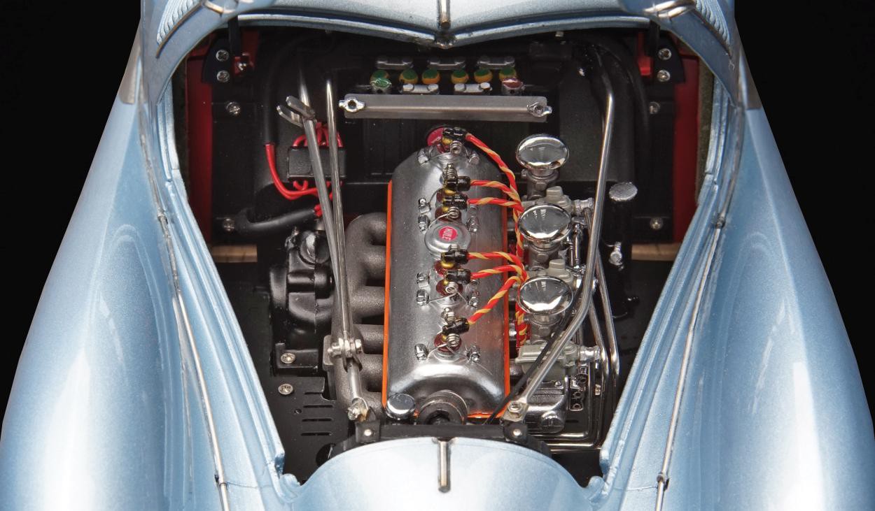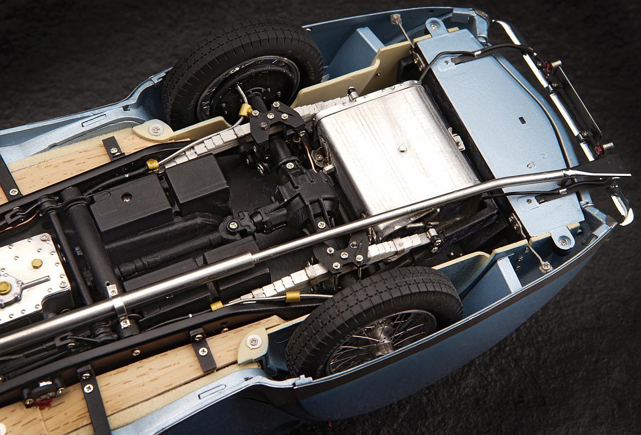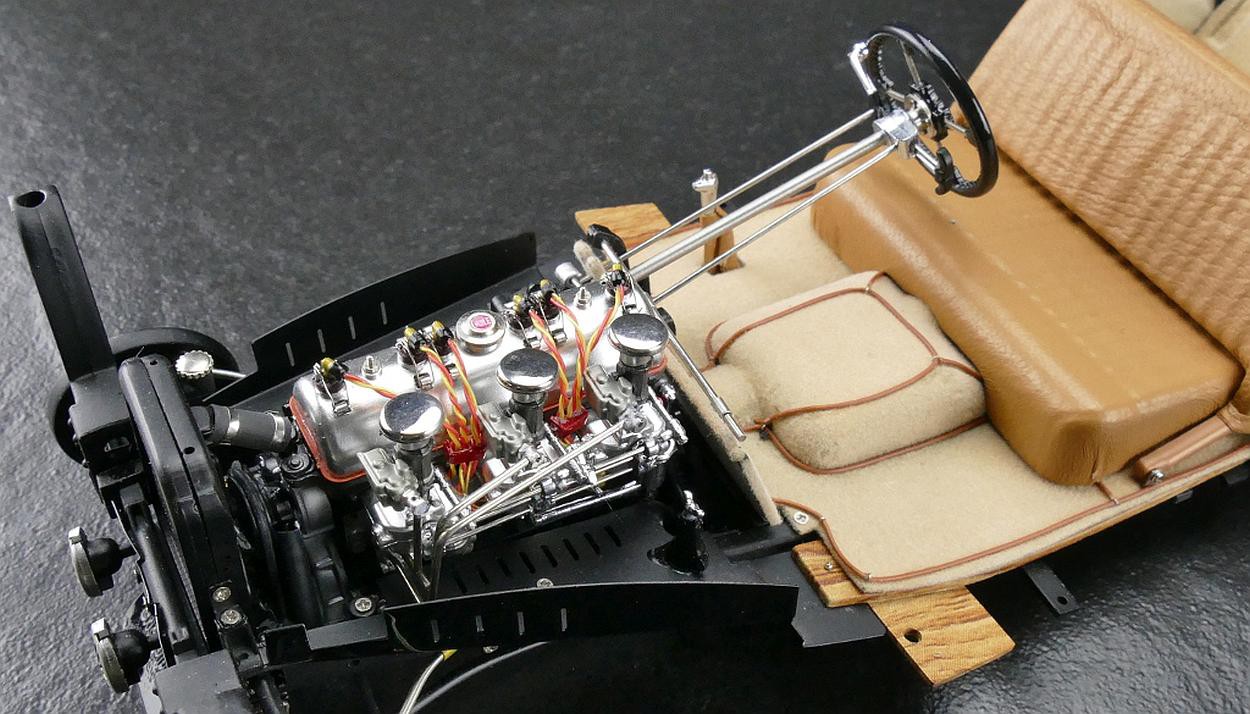 Popis modelu: Autentický až do posledního detailu - rezerva je zajištěna snímatelnými koženými popruhy. Otevíratelná kapota s ventilačními otvory skrývá detailně zpracovaný motor. Všechny podvozkové díly a výfuk, nádrž a odpružení jsou na tomto modelu vytvořeny s nejvyšším důrazem na detail. Sedadla jsou čalouněna kůží, samozřejmostí jsou otevírací dveře, víko zavazadlového prostoru, otevírací je i střešní okno, pohyblivé jsou sluneční clony. Model se skládá ze 1488 součástek.