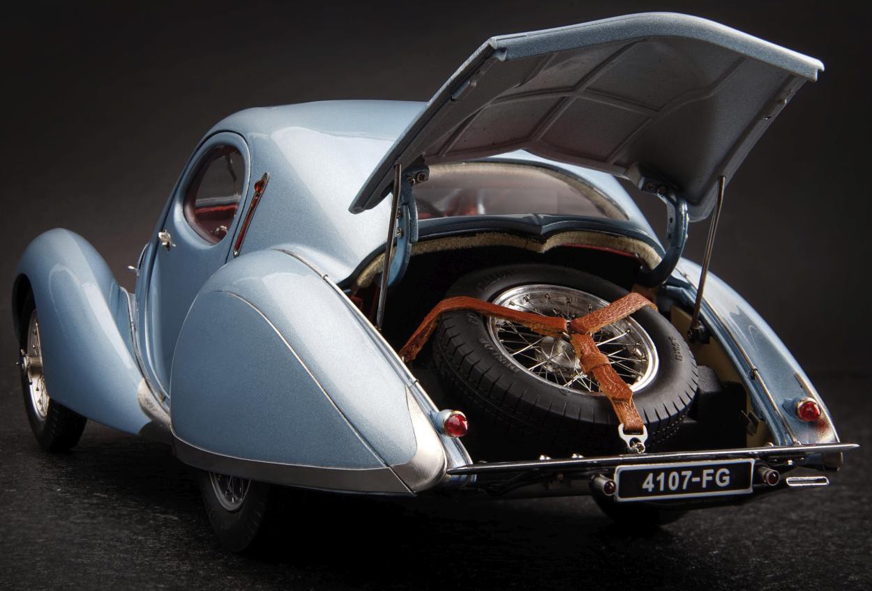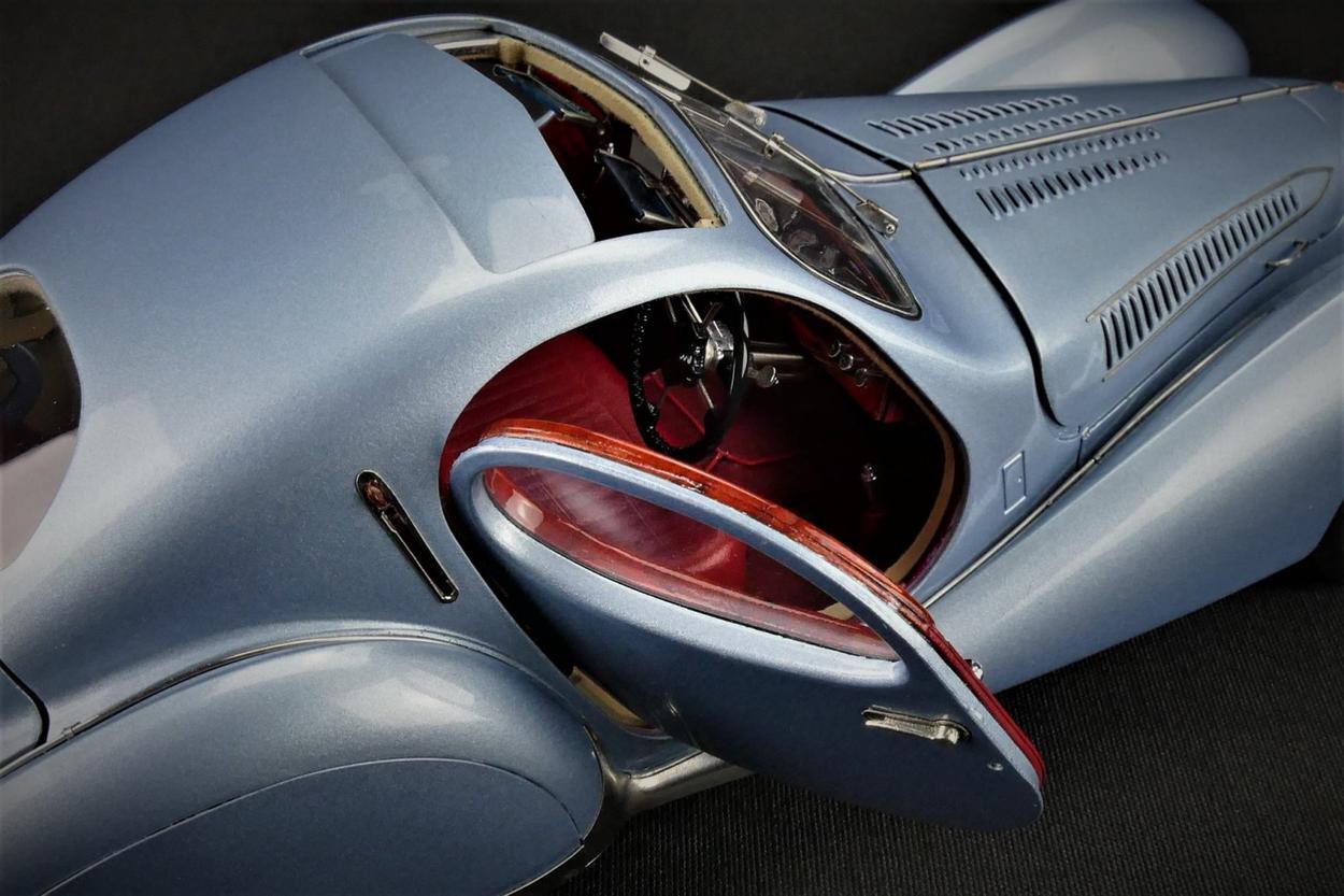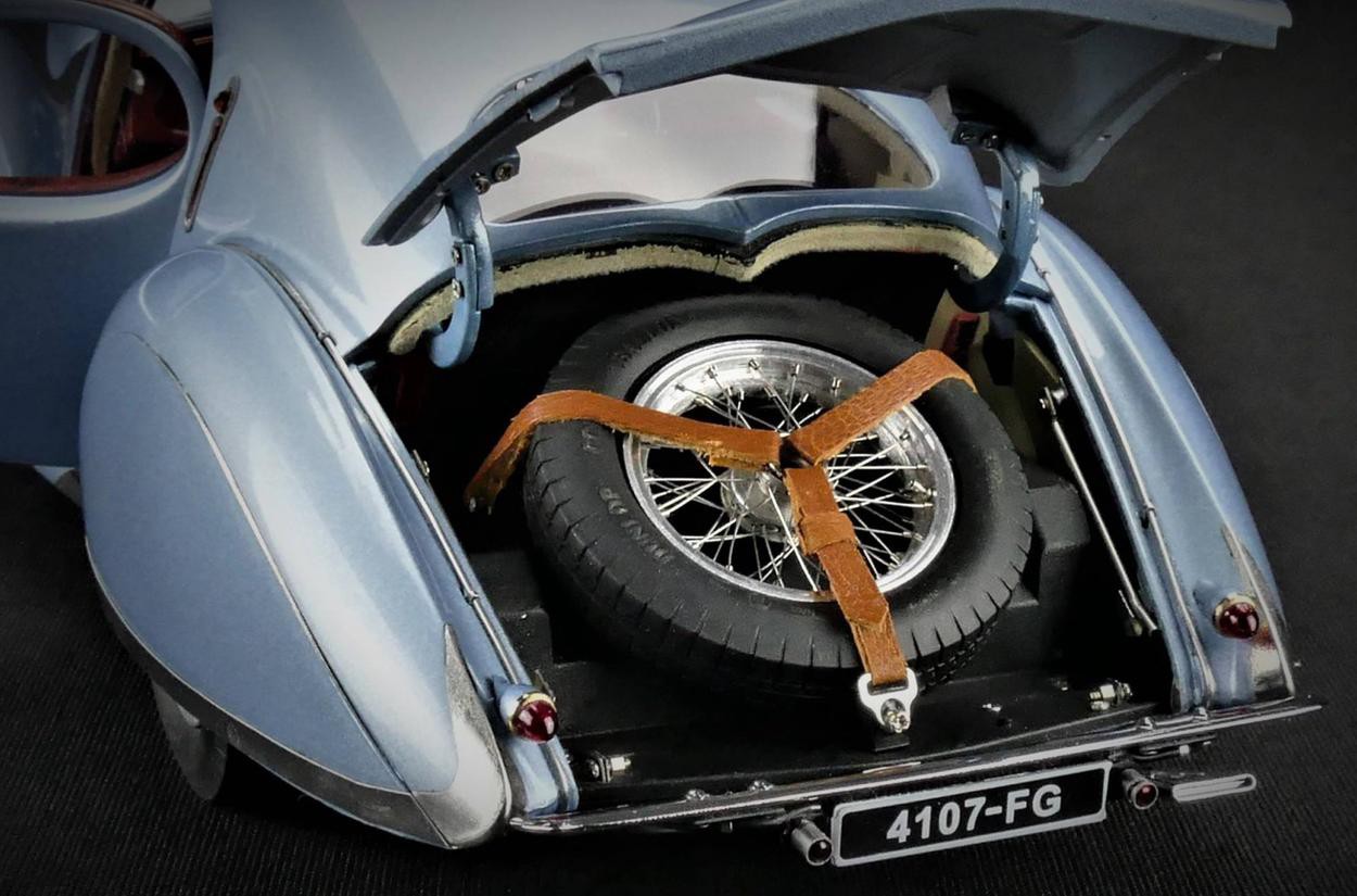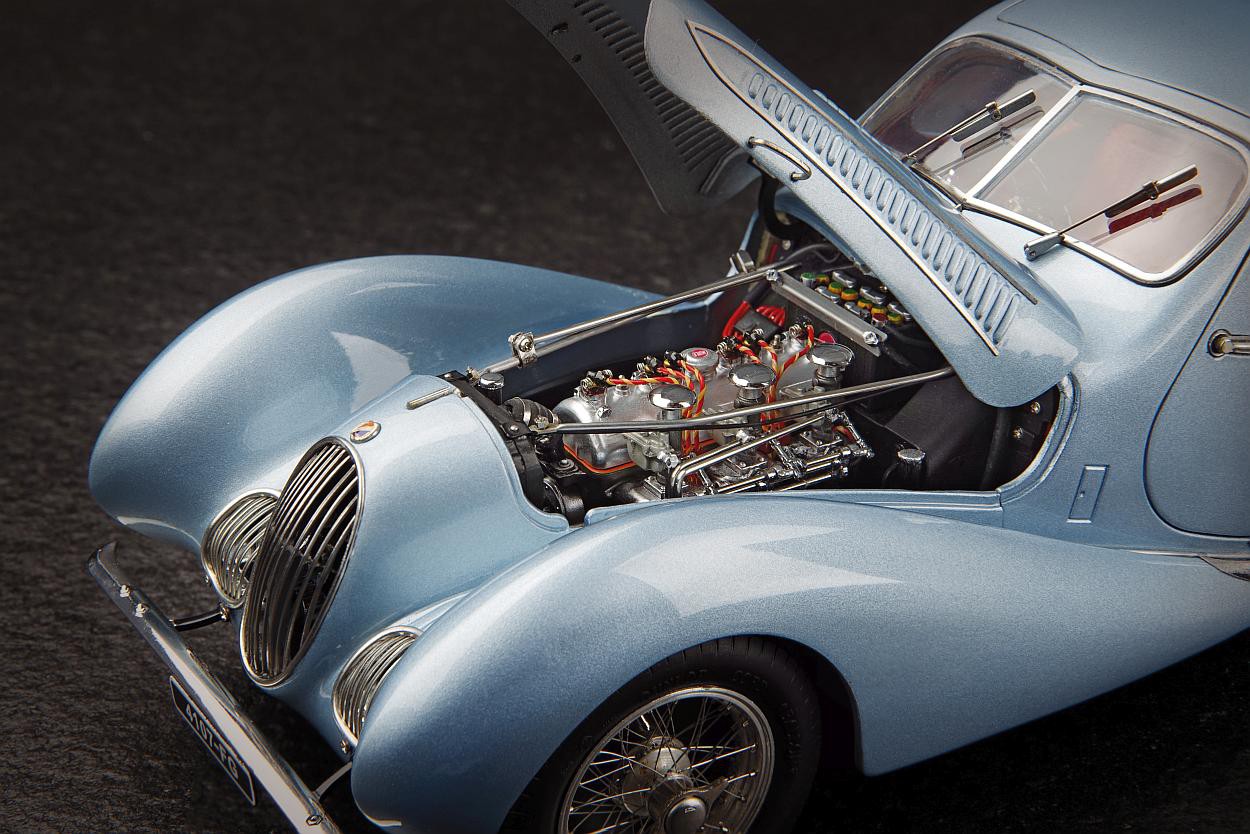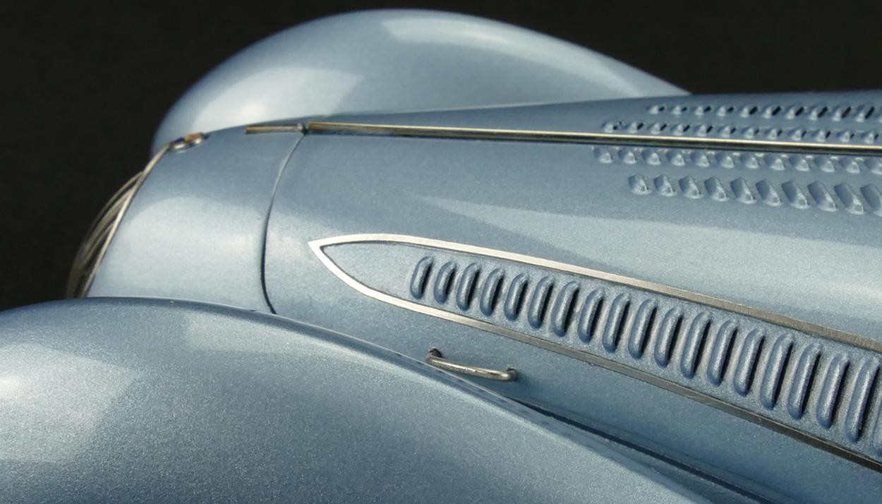 Popis modelu: Autentický až do posledního detailu - rezerva je zajištěna snímatelnými koženými popruhy. Otevíratelná kapota s ventilačními otvory skrývá detailně zpracovaný motor. Všechny podvozkové díly a výfuk, nádrž a odpružení jsou na tomto modelu vytvořeny s nejvyšším důrazem na detail. Sedadla jsou čalouněna kůží, samozřejmostí jsou otevírací dveře, víko zavazadlového prostoru, otevírací je i střešní okno, pohyblivé jsou sluneční clony. Model se skládá ze 1488 součástek.