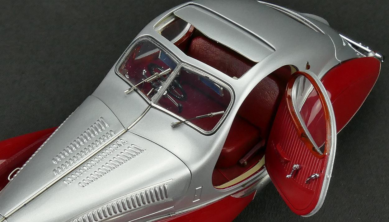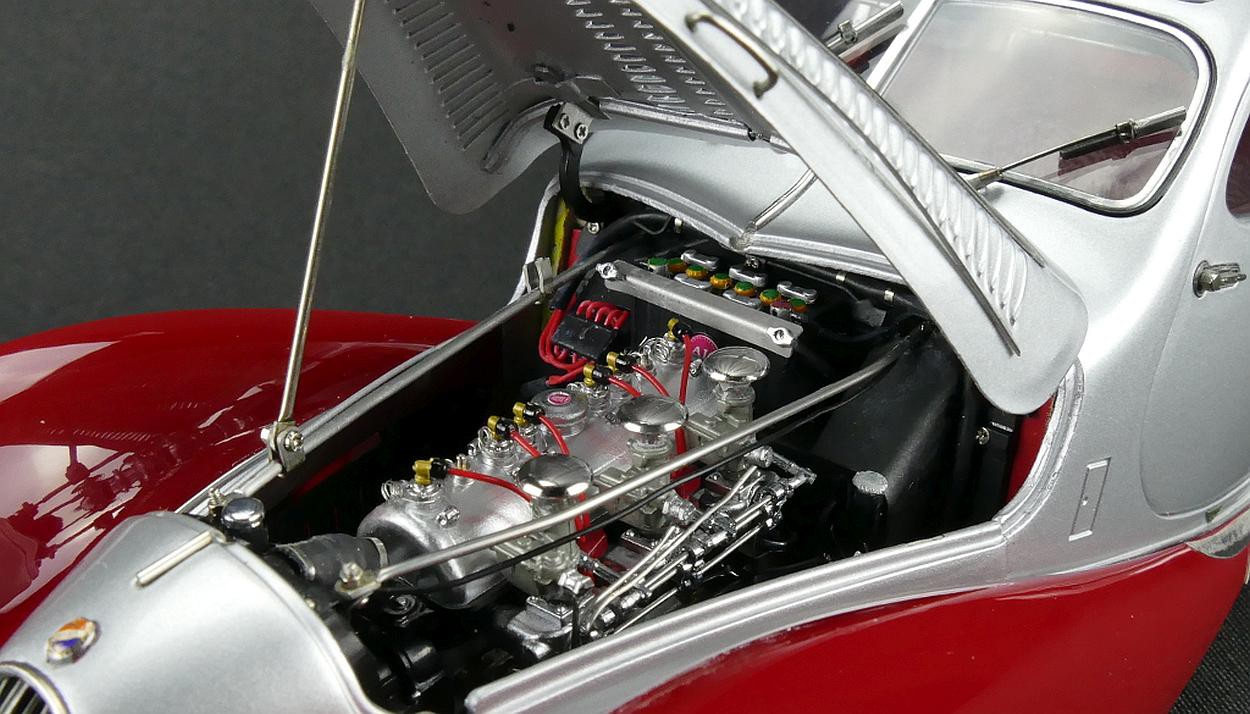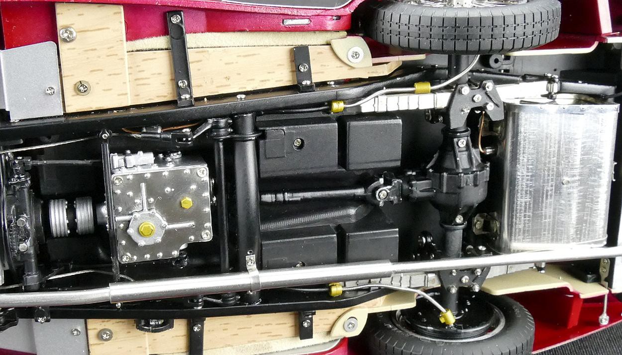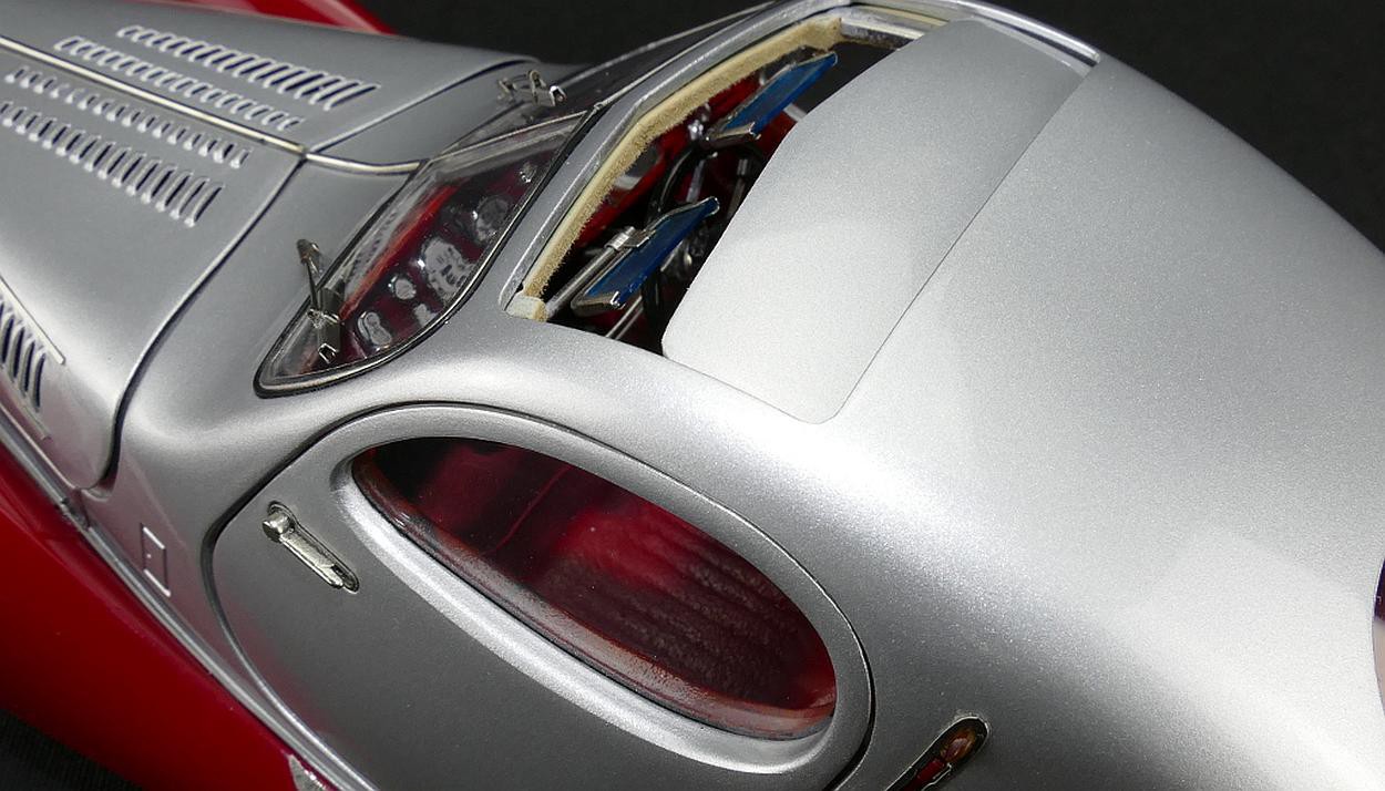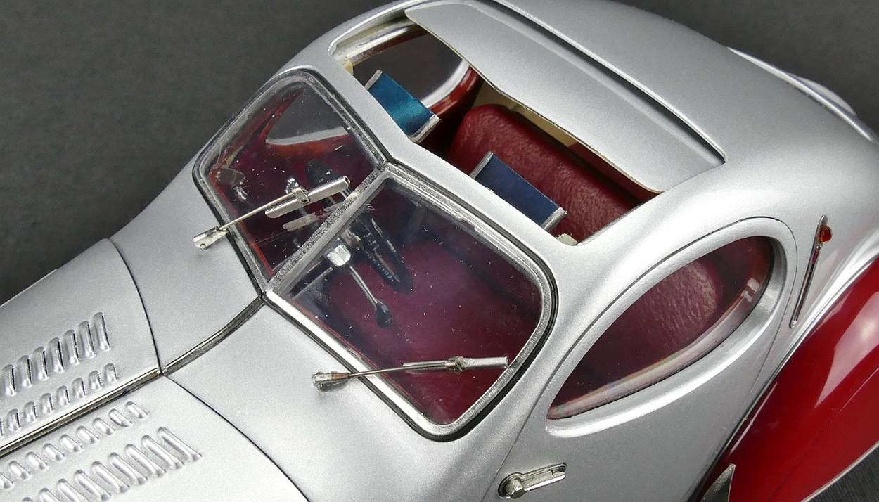 Popis modelu: Autentický až do posledního detailu - rezerva je zajištěna snímatelnými koženými popruhy. Otevíratelná kapota s ventilačními otvory skrývá detailně zpracovaný motor. Všechny podvozkové díly a výfuk, nádrž a odpružení jsou na tomto modelu vytvořeny s nejvyšším důrazem na detail. Sedadla jsou čalouněna kůží, samozřejmostí jsou otevírací dveře, víko zavazadlového prostoru, otevírací je i střešní okno, pohyblivé jsou sluneční clony. Model se skládá ze 1488 součástek.