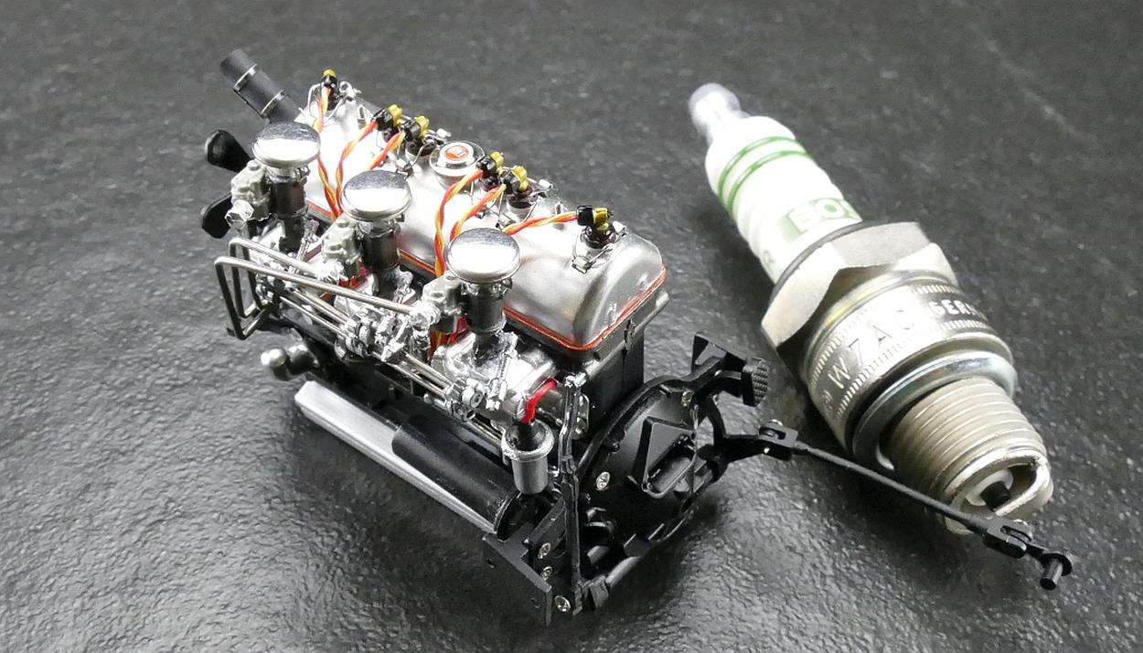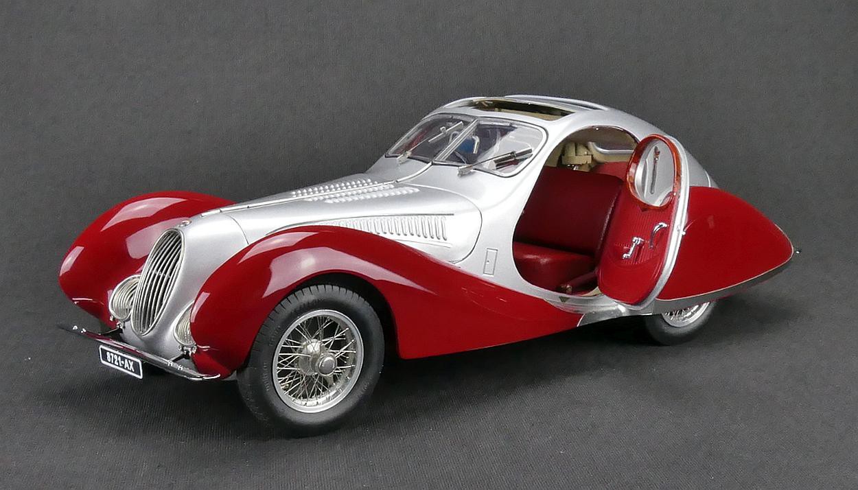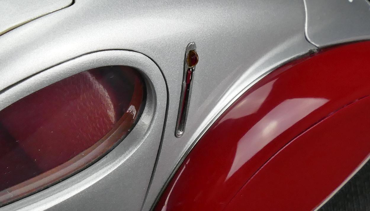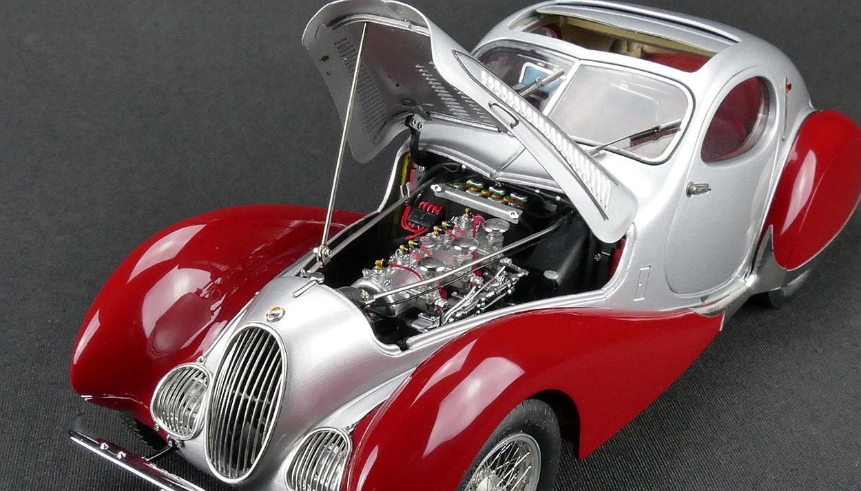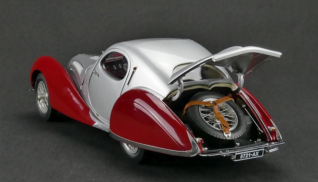 Popis modelu: Autentický až do posledního detailu - rezerva je zajištěna snímatelnými koženými popruhy. Otevíratelná kapota s ventilačními otvory skrývá detailně zpracovaný motor. Všechny podvozkové díly a výfuk, nádrž a odpružení jsou na tomto modelu vytvořeny s nejvyšším důrazem na detail. Sedadla jsou čalouněna kůží, samozřejmostí jsou otevírací dveře, víko zavazadlového prostoru, otevírací je i střešní okno, pohyblivé jsou sluneční clony. Model se skládá ze 1488 součástek.