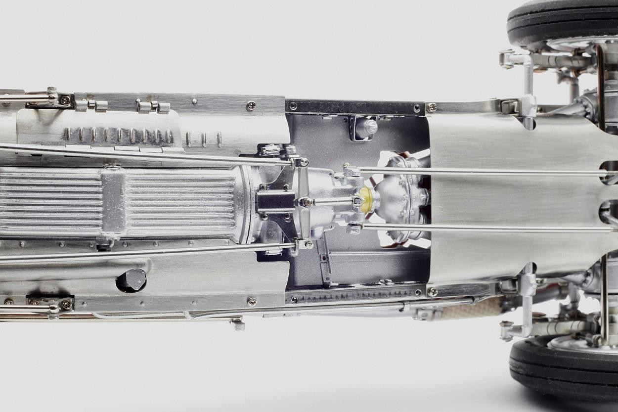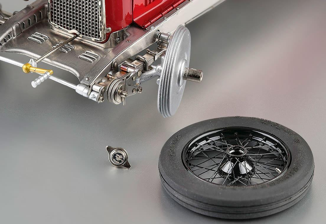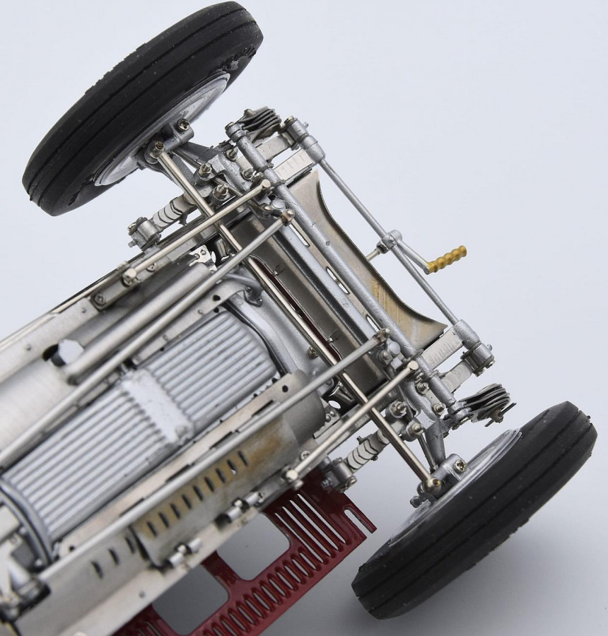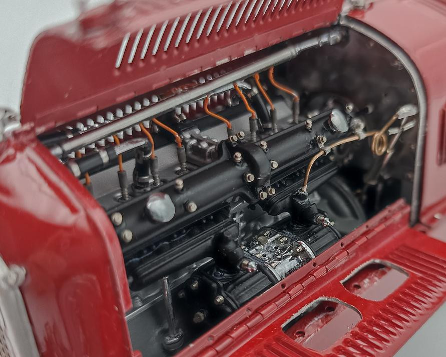 Popis modelu: Sedadla jsou čalouněna kůží, kola jsou již samozřejmě nové konstrukce včetně nipelů a všechna jsou demontovatelná pomocí centrální matice (včetně stranově závislého pravého a levého závitu). Dvoukřídlá kapota motoru se otevírá naplno na kovových čepech. Otevírací jsou i víčka olejové a benzínové nádrže. Model se skládá z 1805 součástek !!!