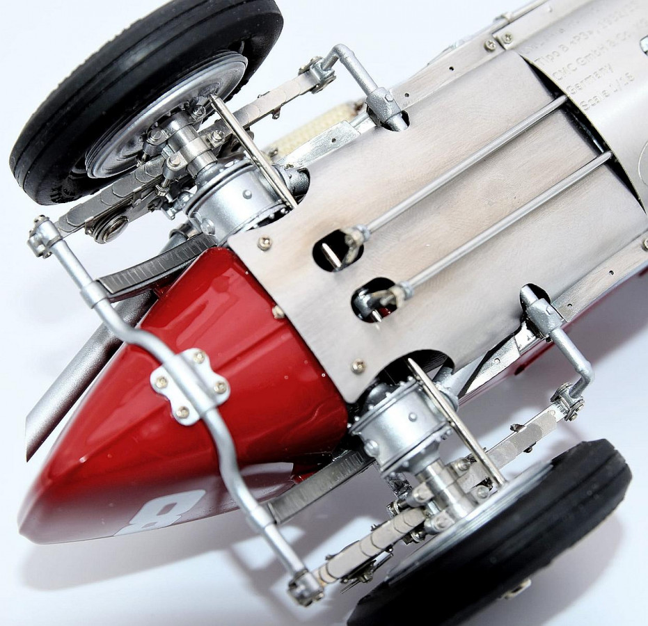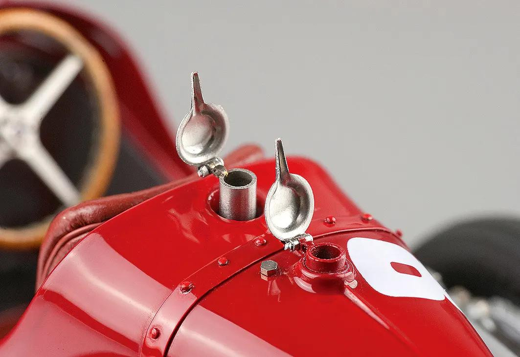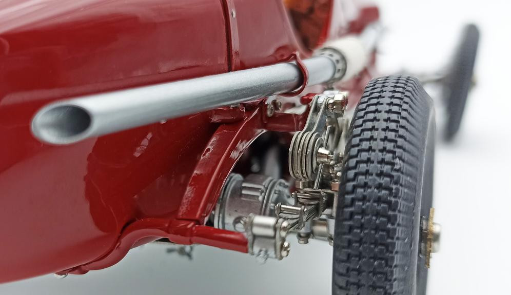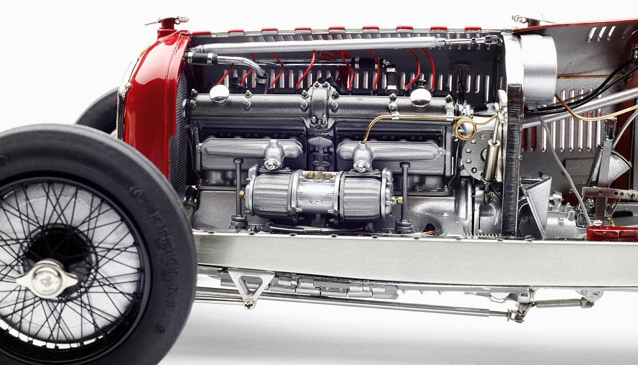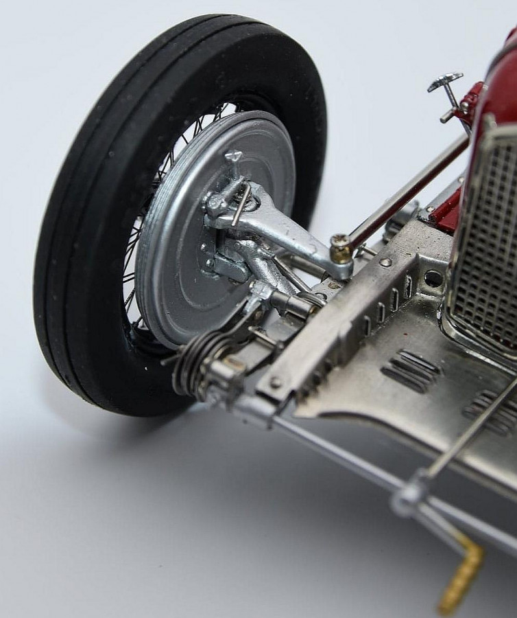 Popis modelu: Sedadla jsou čalouněna kůží, kola jsou již samozřejmě nové konstrukce včetně nipelů a všechna jsou demontovatelná pomocí centrální matice (včetně stranově závislého pravého a levého závitu). Dvoukřídlá kapota motoru se otevírá naplno na kovových čepech. Otevírací jsou i víčka olejové a benzínové nádrže. Model se skládá z 1805 součástek !!!