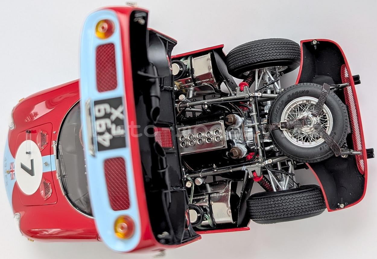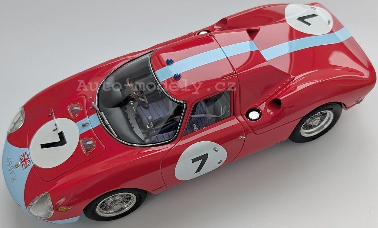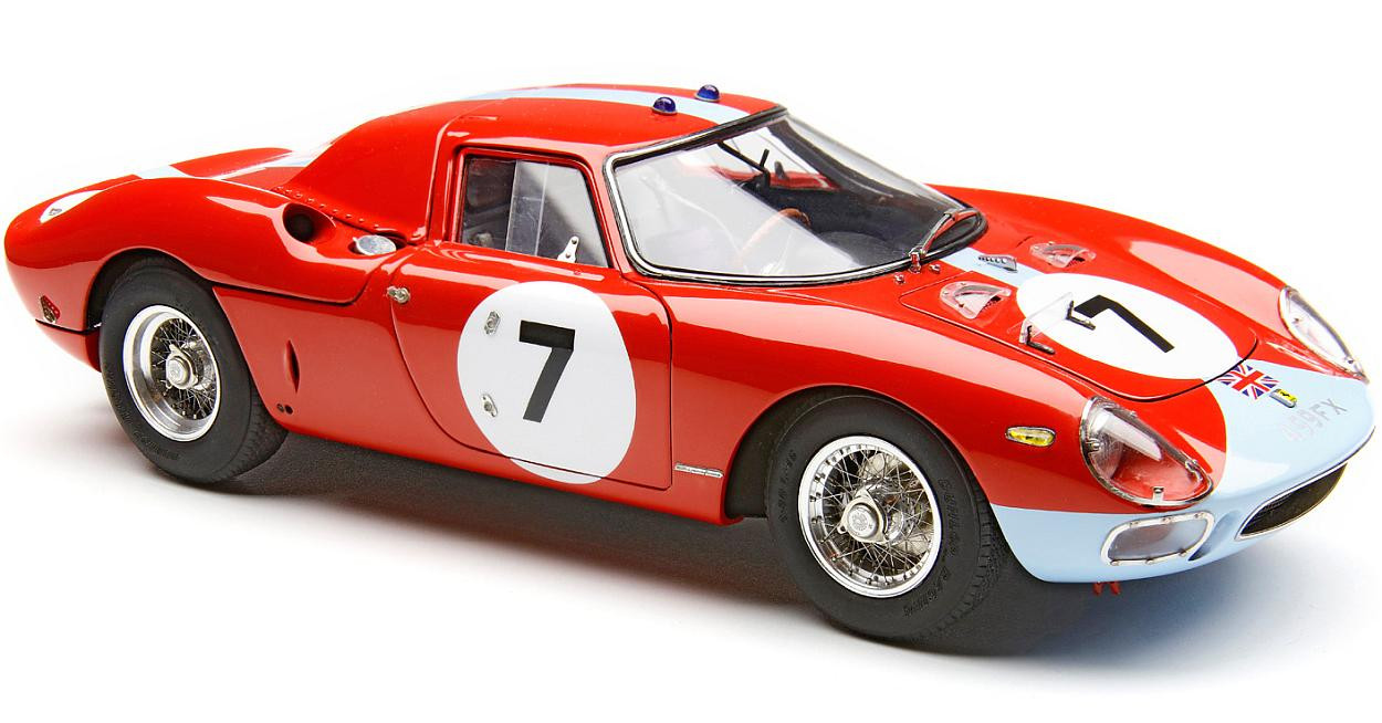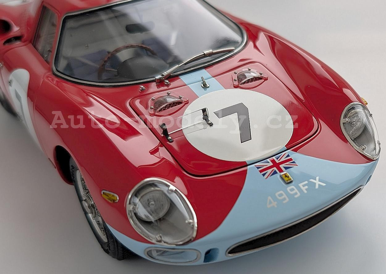 Popis modelu: Model má otevírací dveře, kapotu nad motorem, přední kapotu, víčka nádrží, posuvná boční okna, demontovatelná kola, látkou čalouněná sedadla. Jde o model, který vychází z vozu s pravostranným řízením, má více jak 1800 součástek!. Originál vozu, vyhrál závod Reims 12h 1964, Chassis 5895, Hill/Bonnier, RHDL.