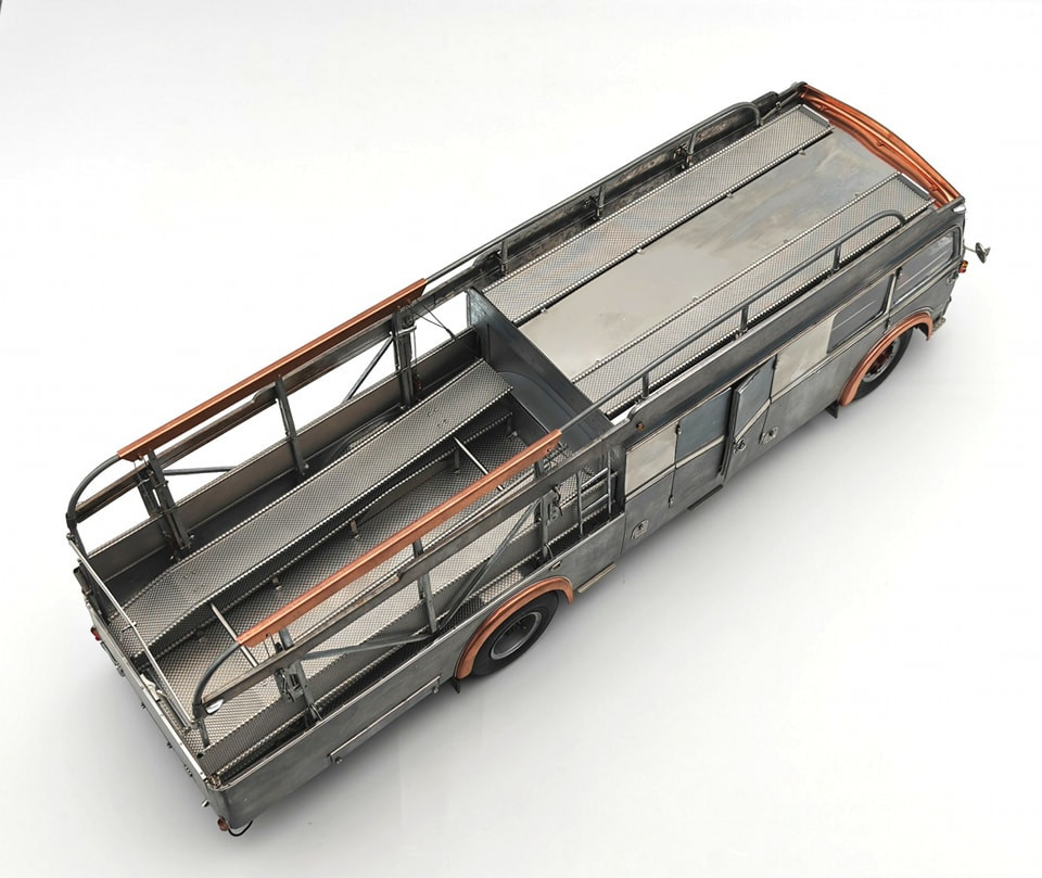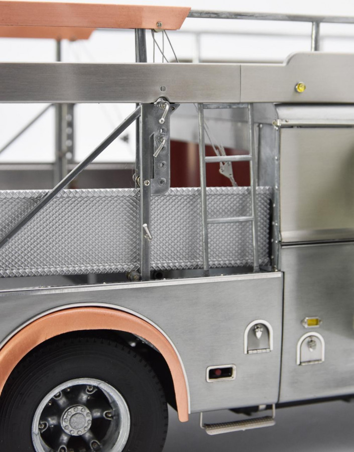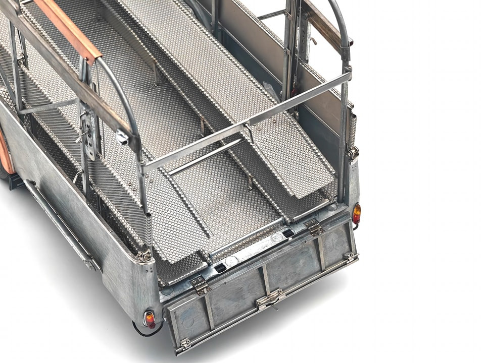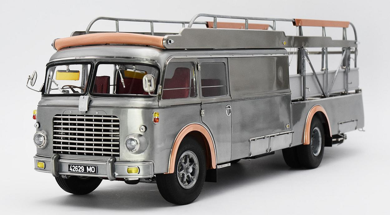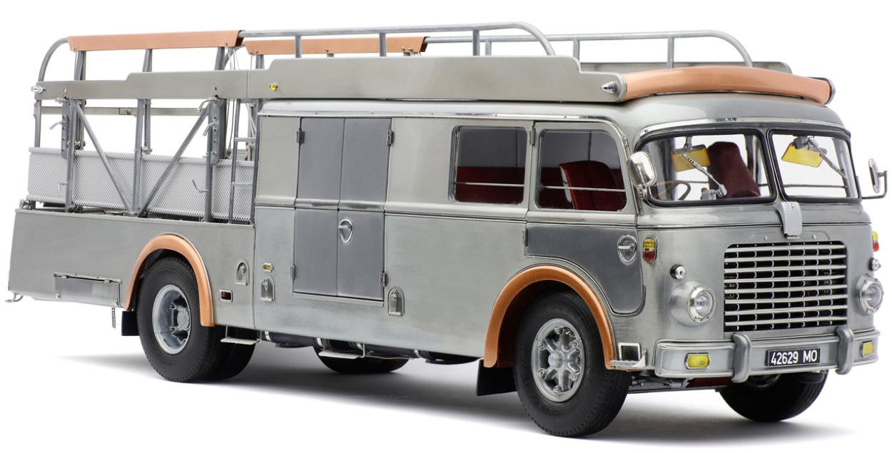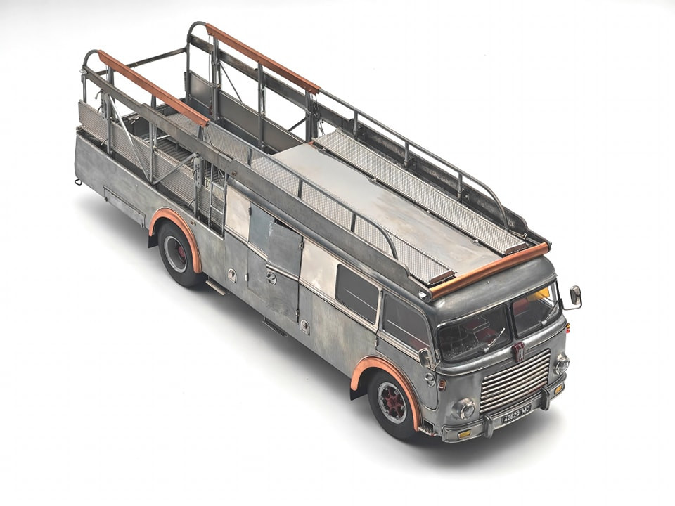 Popis modelu: Tato replika transportéru závodních vozů je sestavena z 3115 jednotlivých dílů. Vysoce detailním a funkčním kladkostrojem na vozy může být ručně pohybováno nahoru a dolů. Nájezdy jsou vyrobeny z plechů s autentickou povrchovou úpravou. Zadní víko je opatřeno funkčním trubkovým uzamykacím mechanismem. Rampa je zajištěna pomocí šroubovacích kolíků, vyjmutelné je rezervní kolo, zde je funkční pružinový zámek, za odnímatelným krytem je funkční přírubové tažné zařízení. Vnější zpětná zrcátka jsou nastavitelná, interier je čalouněn kůží. Pod vozem jsou otevírací schránky, včetně zajišťovacích klínů. Víčka hrdla nádrže a stupačky mohou být otevřeny a nebo zavřeny, odklopný je panel Fiat nad přední maskou, pod ním je hrdlo chladiče, jehož víčko může být odšroubováno. Uvnitř kabiny je odklápěcí kryt motoru, funkční stínítka proti slunci. Kromě otevíratelných dveří do kabiny je přístupný i prostor dílny, který je vybaven přihrádkami na náhradní díly. No, chcete snad ještě něco? Pokud ano, pak již jedině originál (a ten do obýváku nepostavíte). Provedení modelu se řadí k dříve již vyráběným modelům pouze v nástřiku bezbarvým lakem.