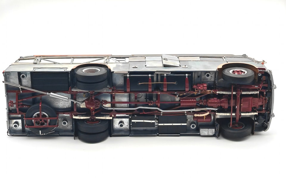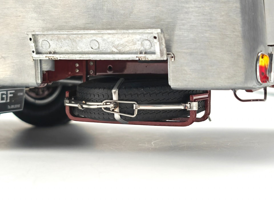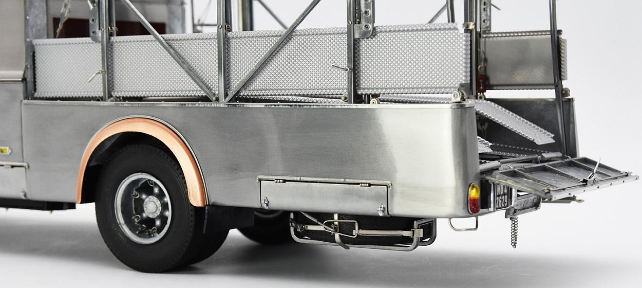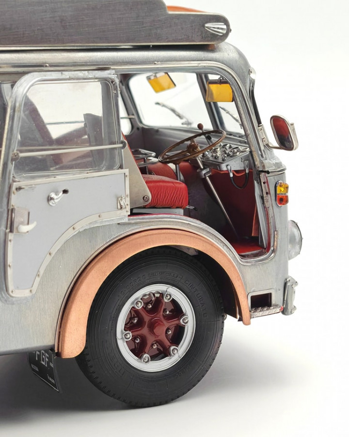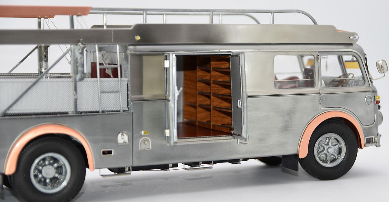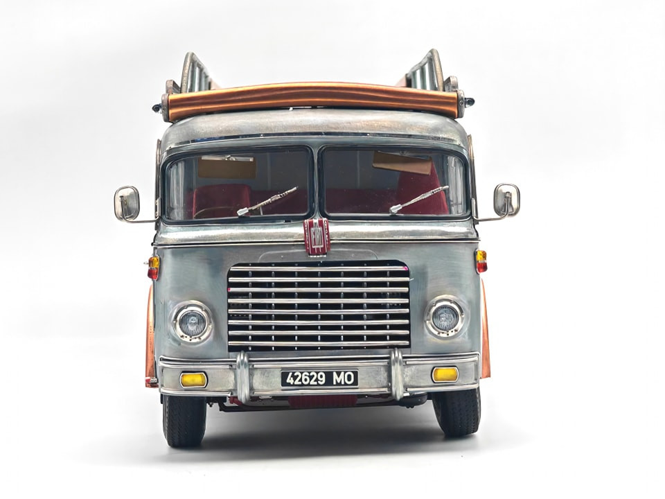 Popis modelu: Tato replika transportéru závodních vozů je sestavena z 3115 jednotlivých dílů. Vysoce detailním a funkčním kladkostrojem na vozy může být ručně pohybováno nahoru a dolů. Nájezdy jsou vyrobeny z plechů s autentickou povrchovou úpravou. Zadní víko je opatřeno funkčním trubkovým uzamykacím mechanismem. Rampa je zajištěna pomocí šroubovacích kolíků, vyjmutelné je rezervní kolo, zde je funkční pružinový zámek, za odnímatelným krytem je funkční přírubové tažné zařízení. Vnější zpětná zrcátka jsou nastavitelná, interier je čalouněn kůží. Pod vozem jsou otevírací schránky, včetně zajišťovacích klínů. Víčka hrdla nádrže a stupačky mohou být otevřeny a nebo zavřeny, odklopný je panel Fiat nad přední maskou, pod ním je hrdlo chladiče, jehož víčko může být odšroubováno. Uvnitř kabiny je odklápěcí kryt motoru, funkční stínítka proti slunci. Kromě otevíratelných dveří do kabiny je přístupný i prostor dílny, který je vybaven přihrádkami na náhradní díly. No, chcete snad ještě něco? Pokud ano, pak již jedině originál (a ten do obýváku nepostavíte). Provedení modelu se řadí k dříve již vyráběným modelům pouze v nástřiku bezbarvým lakem.