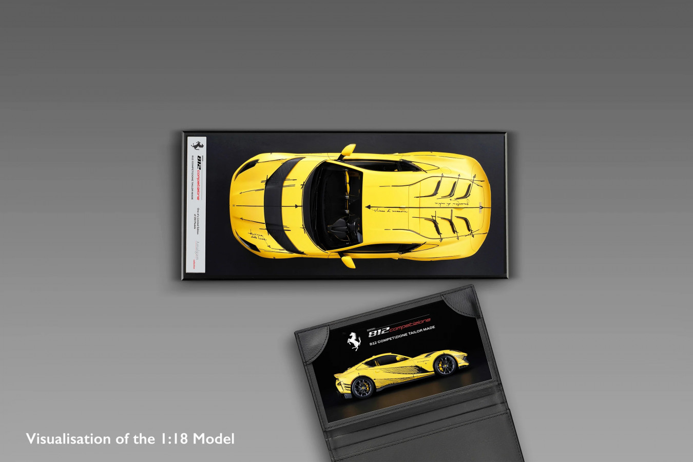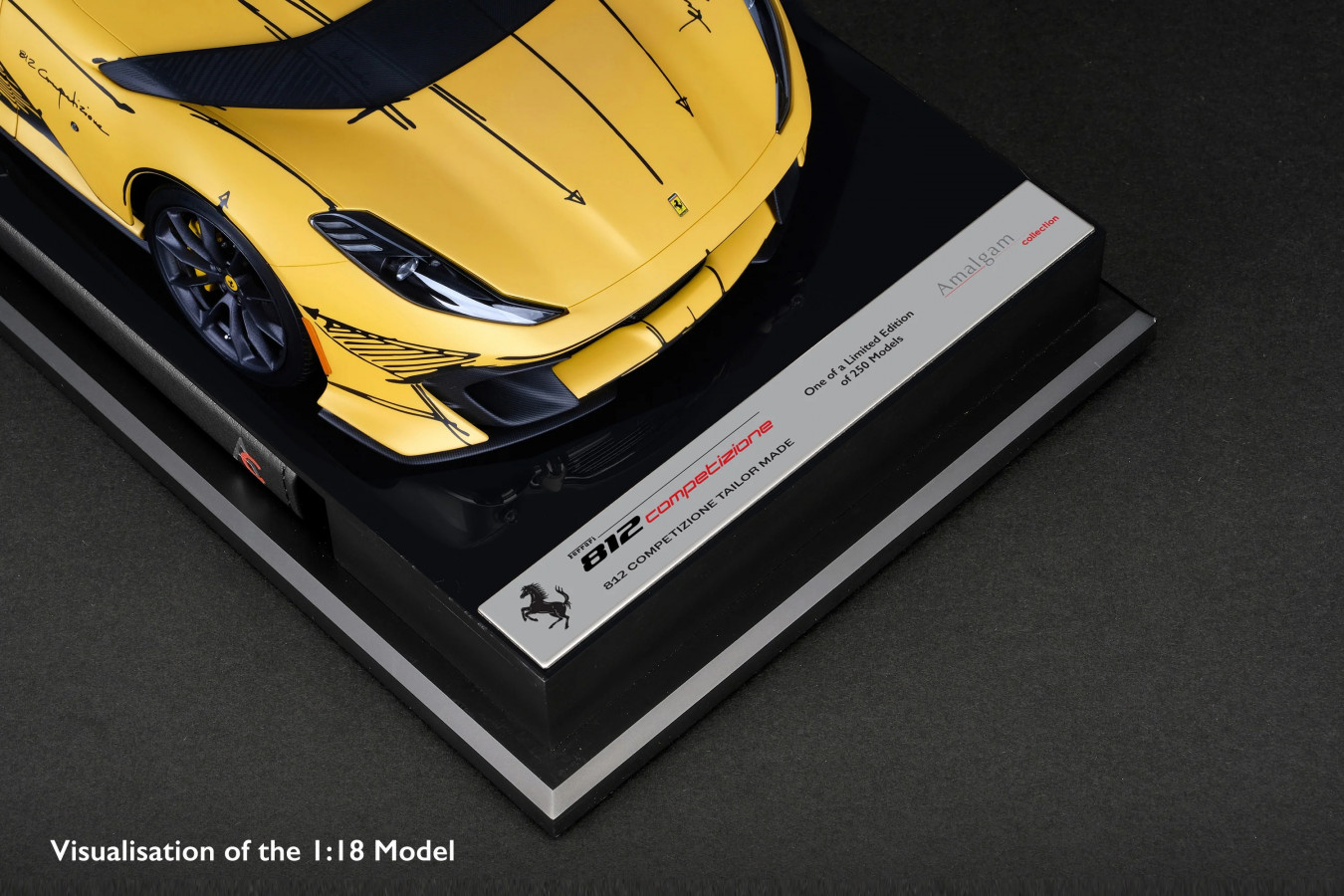 S využitím originálních CAD dat dodaných Ferrari Centro Stile budou řemeslníci Amalgamu schopni dokonale znovu vytvořit každý rafinovaný detail jedinečného 812 Competizione Tailor Made, od přesně namíchaných originálních automobilových laků, aby přesně odpovídaly matnému exteriéru skutečného vozu Giallo Tristrato, až po interiér, který dokonale zachycuje umění uvnitř skutečného vozu. Posledním znamenitým dotekem bude aplikace pečlivě zmenšené kresby v matném Nero DS Sketch. Model obdrží schválení od hlavního designéra Flavia Manzoniho a jeho konstrukčního týmu, jakmile budou plně spokojeni s jeho přesností zobrazení.