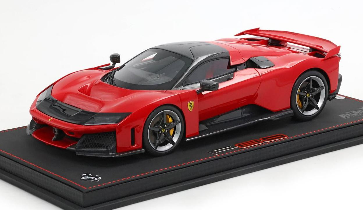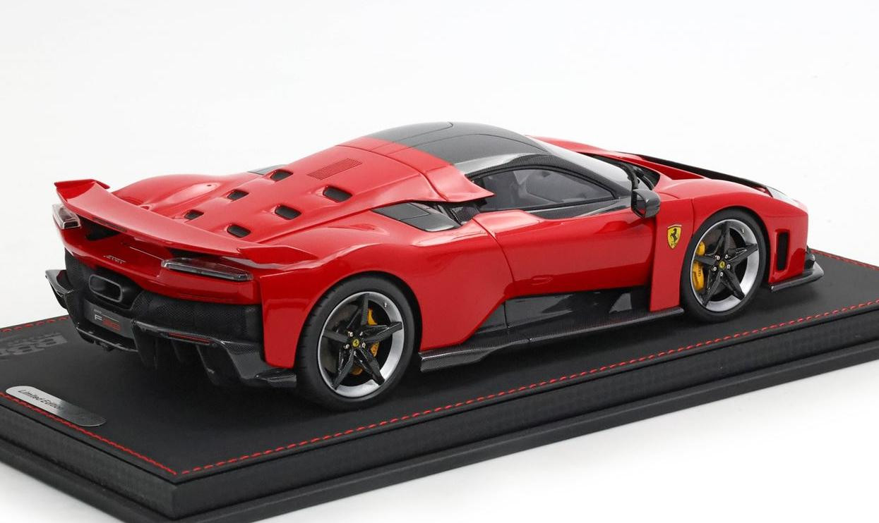 Popis modelu: Model je vyroben z pryskyřičné slitiny RESIN, při této technologii výrobce dosáhl maximální věrnosti modelu ku originálu za cenu nemožnosti cokoli otevřít. Model je dodáván přišroubován na podkladové desce. Model je lakován do barvy - Rosso Corsa a má kola kombinace stříbrná a karbon.